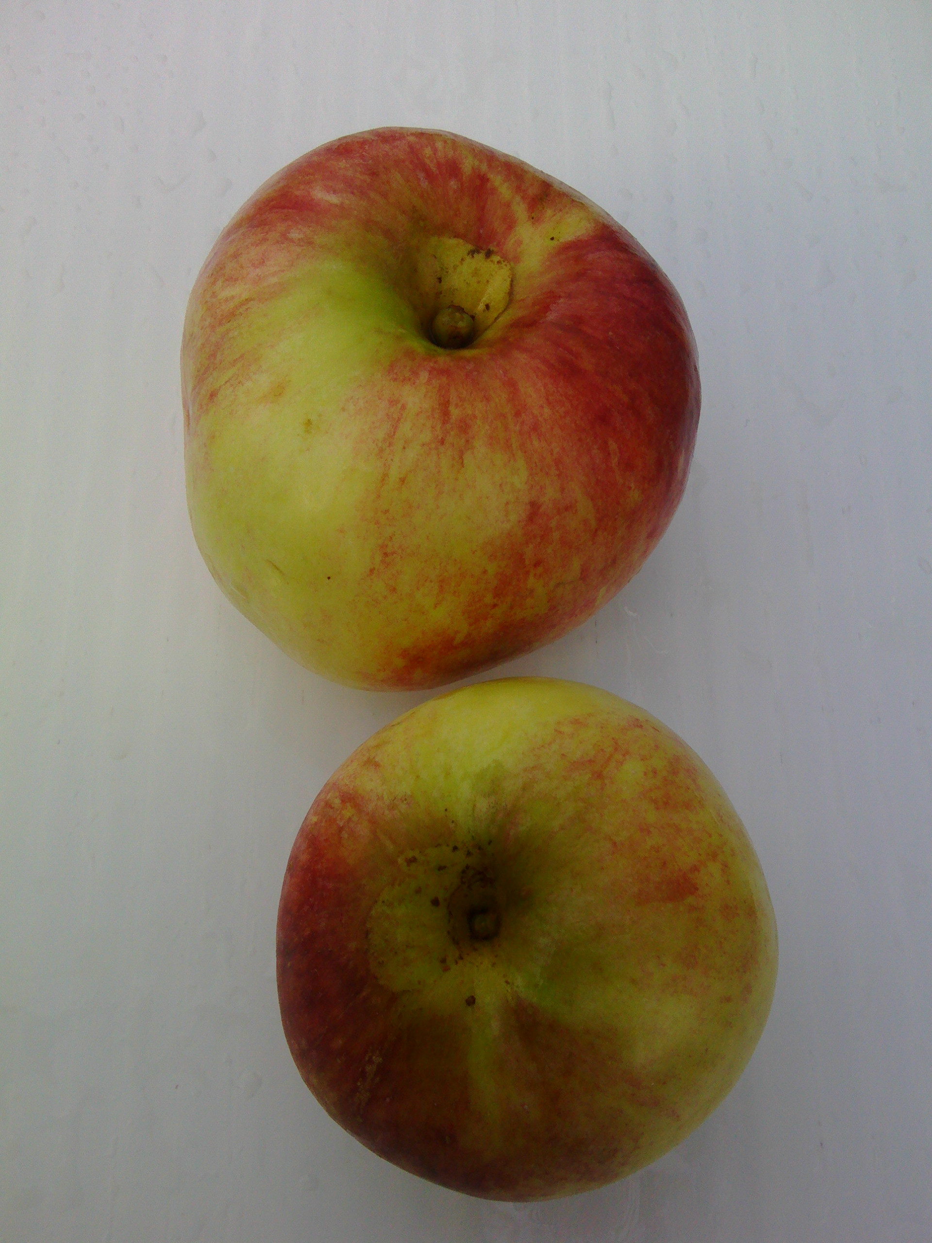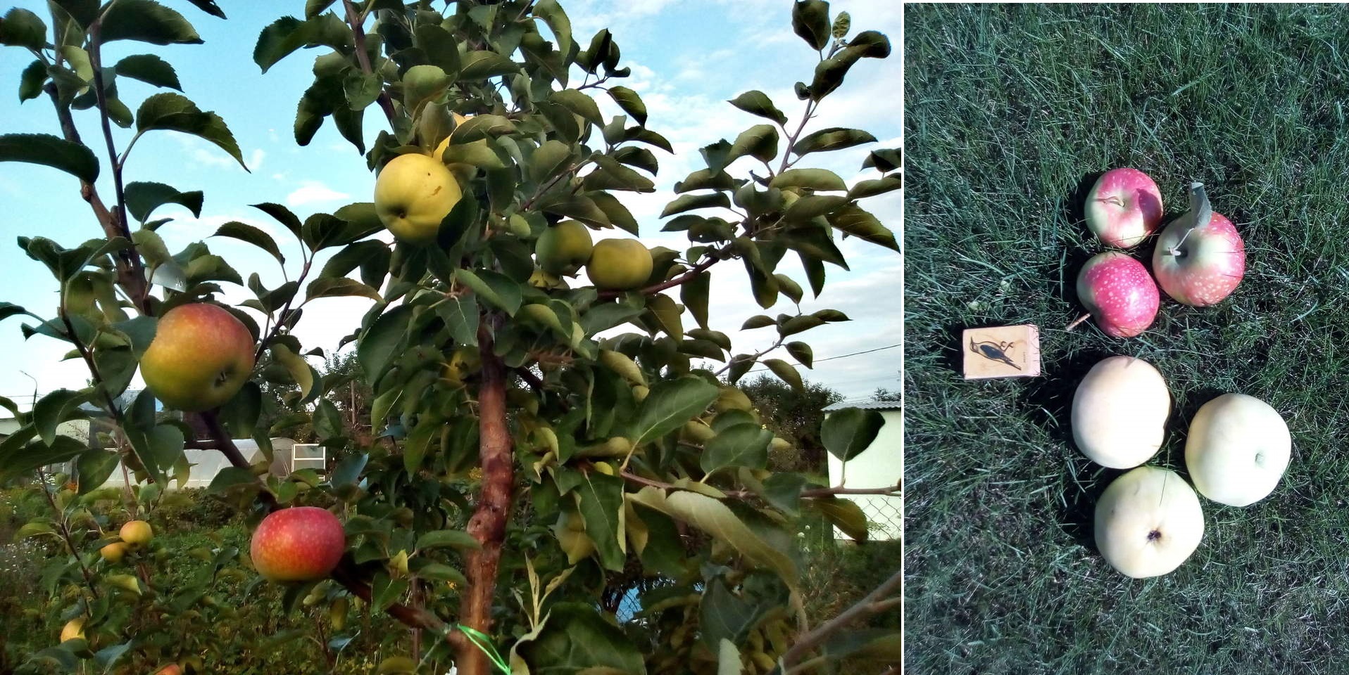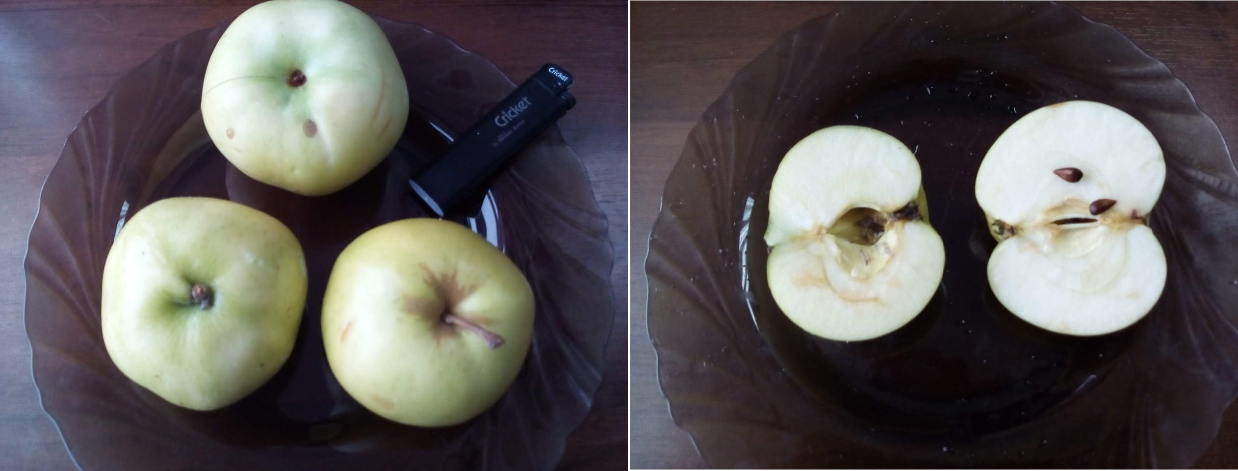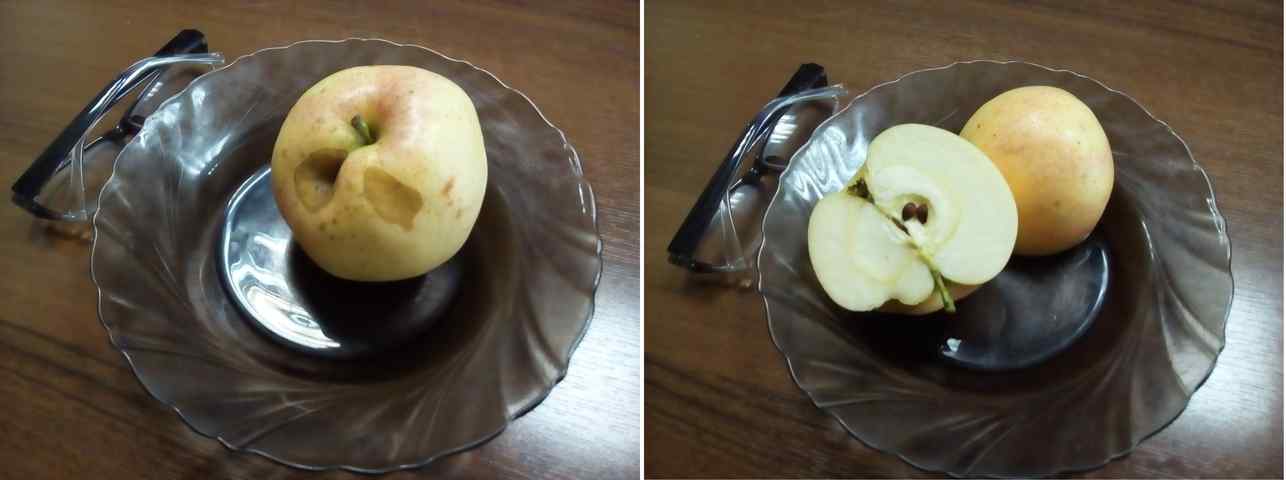 Плоды хранятся в холодильнике до 30 дней, некоторые экземпляры у меня пролежали в 2 раза дольше. Мне встретились два типа внешнего вида. Большая часть плодов имела очень короткую плодоножку, как яблоко слева. Но встречаются плоды и с более длинной плодоножкой и немного оржавленной воронкой (справа). Верхнее яблоко – это не Фея, а колонновидный сорт Президент, который созревает на месяц позже. Спутать очень легко. Различия хорошо видны на разрезе: у Феи (слева) открытая семенная трубка и поврежденная камера, что можно отнести к серьезным недостаткам сорта, о котором официальные описания часто умалчивают. Вкус обеих сортов имеет некоторое сходство с Папировкой. Но если у Президента это лишь слабый намек, то у Феи, по моим ощущениям, доля Папировки во вкусе составляет не менее 80%, мякоть более плотная, более сочная, и заметно более кислая.