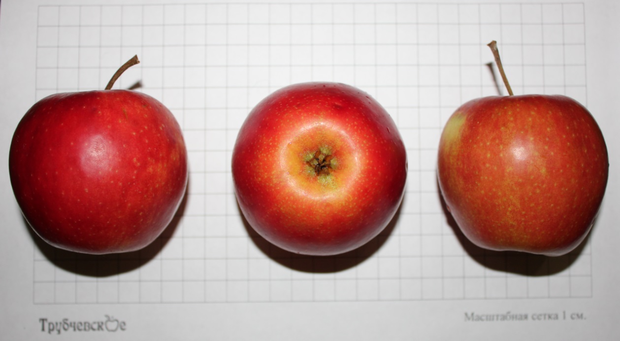 Плоды средней и вышесредней величины, одномерные, массой около 150г и больше, округлой ширококонической формы, напоминающие форму Апорта. . Кожица гладкая, сухая, с заметным восковым налетом.