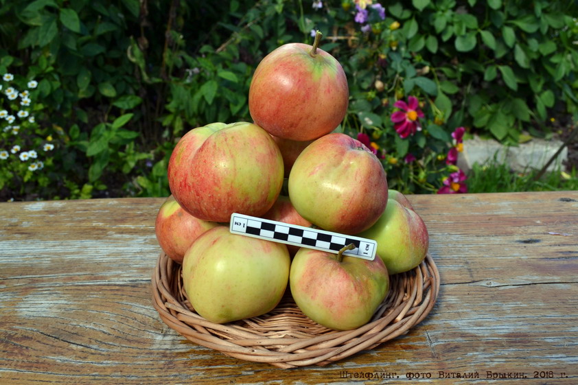 Плоды крупные, более 200 г, репчатые, правильной формы. Окраска основная: зеленовато-желтая, покровная: по большей части плода, размытая и слегка полосатая, ярко-малиновая. Мякоть кремоватая, средней плотности, сочная, кисло-сладкого гармоничного вкуса, с сильным ароматом. Съемная зрелость: конец августа - начало сентября. В холодильнике сохраняются до двух месяцев. Транспортабельность хорошая.