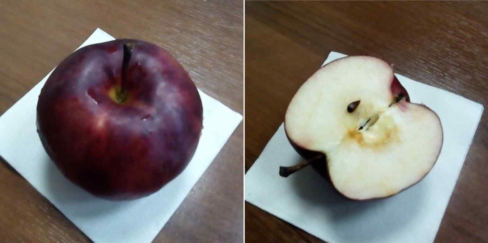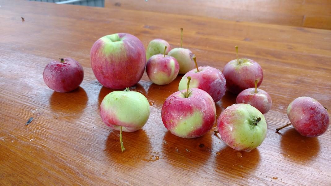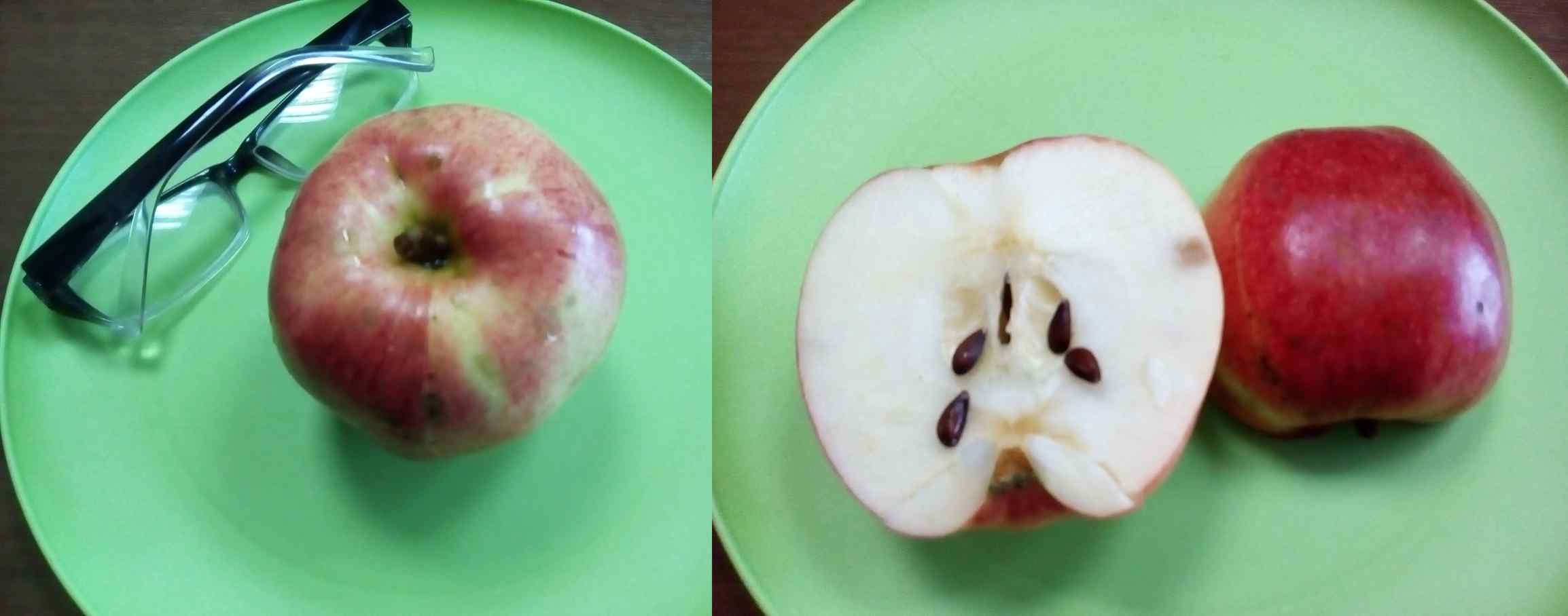 С дегустацией яблока из сада В.Ю.Ольховича я сильно припозднился, ошибочно посчитав сорт поздним. Но это лишь добавило интриги. Яблоко оказалось не только вполне съедобным, но и произвело очень приятное впечатление. Мякоть еще вполне упругая, сочная, но кислоты осталось уже совсем немного. Быстро темнеет на срезе. Хорошо видны розовые прожилки. Больше всего поразил нежный аромат, подобного которому я еще не встречал. У кого пройдет по зимостойкости, будет очень замечательный вариант позднелетнего или, скорее, осеннего сорта. В неидеальных условиях яблоко сохранилось практически до начала зимы.