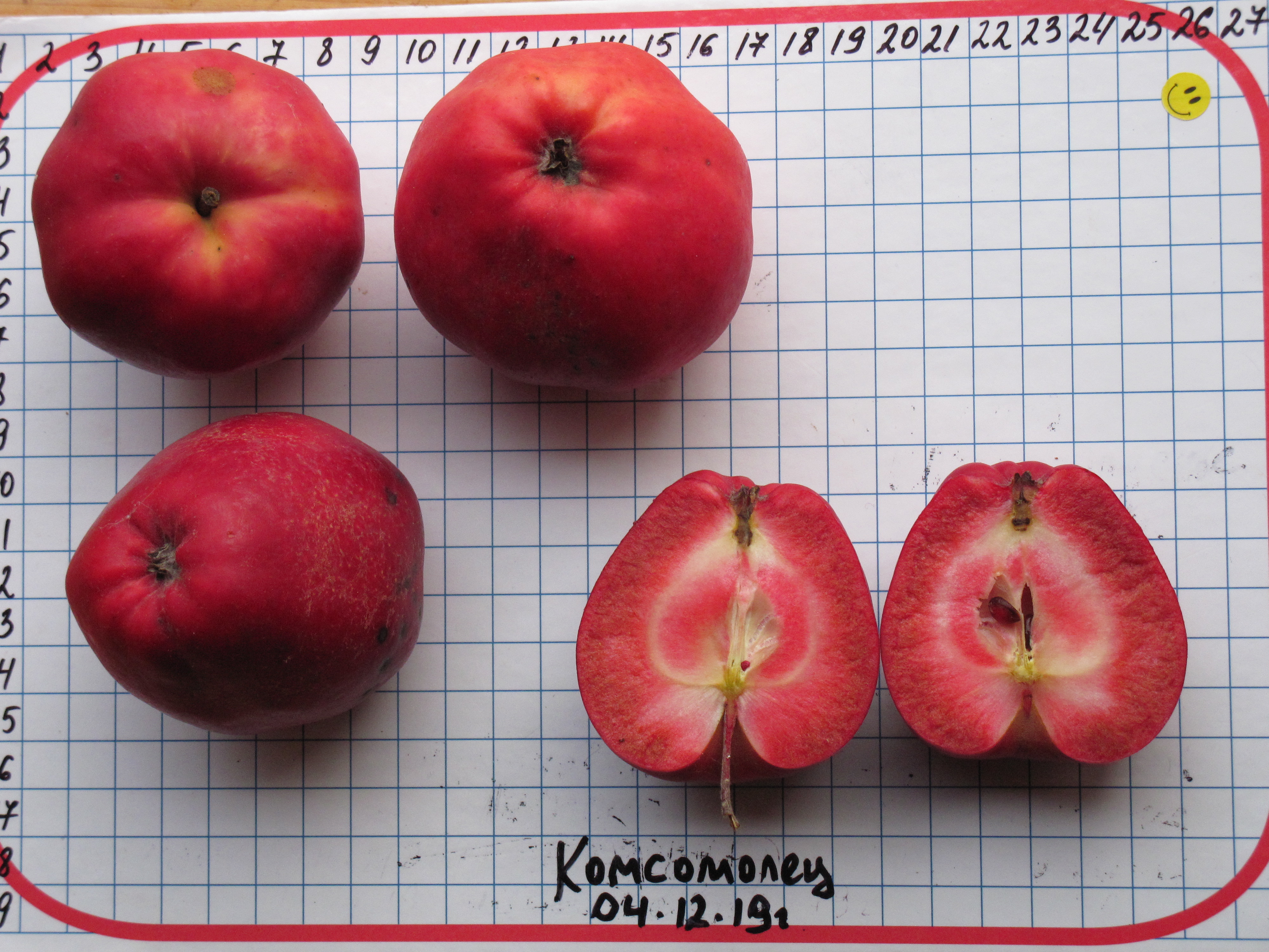 Зимостойкость выше средней. К парше недостаточно устойчив. Плодоносить начинает на 5-6-й год после посадки. Урожайность средняя. Дерево средней силы роста. Крона округлая, раскидистая, средней густоты. Листья кожистые, эллиптические, суженные к обоим концам. При распускании с обеих сторон покрыты войлочно-ворсистым опушением. Полностью развернувшиеся листья имеют темно-зеленую с красноватым или фиолетово-красным оттенком окраску. Плоды среднего размера, удлиненные, усеченно-конические с глубокими выемками по всей поверхности плода (это характерный признак данного сорта). Основная окраска зеленоватая, покровная - густо-розового цвета (на освещенной стороне несколько ярче), размытая по всему плоду, с мелкими сероватыми пятнышками. Воронка глубокая, неровная, плодоножка средняя. Блюдце узкое, глубокое, неровное, чашечка закрытая. Мякоть розовая, с более интенсивным окрашиванием у семенного гнезда и под кожицей, плотная, несколько суховатая, кисло-сладкого вкуса с терпкостью. В плодах в среднем содержится: сухих веществ – 11,6%, титруемых кислот - 0,79%, сахаров – 9,93%, отношение сахара к кислоте – 12,6, аскорбиновой кислоты - 14,6 мг/100 г. Съемная зрелость наступает в середине сентября. Плоды могут храниться до февраля.