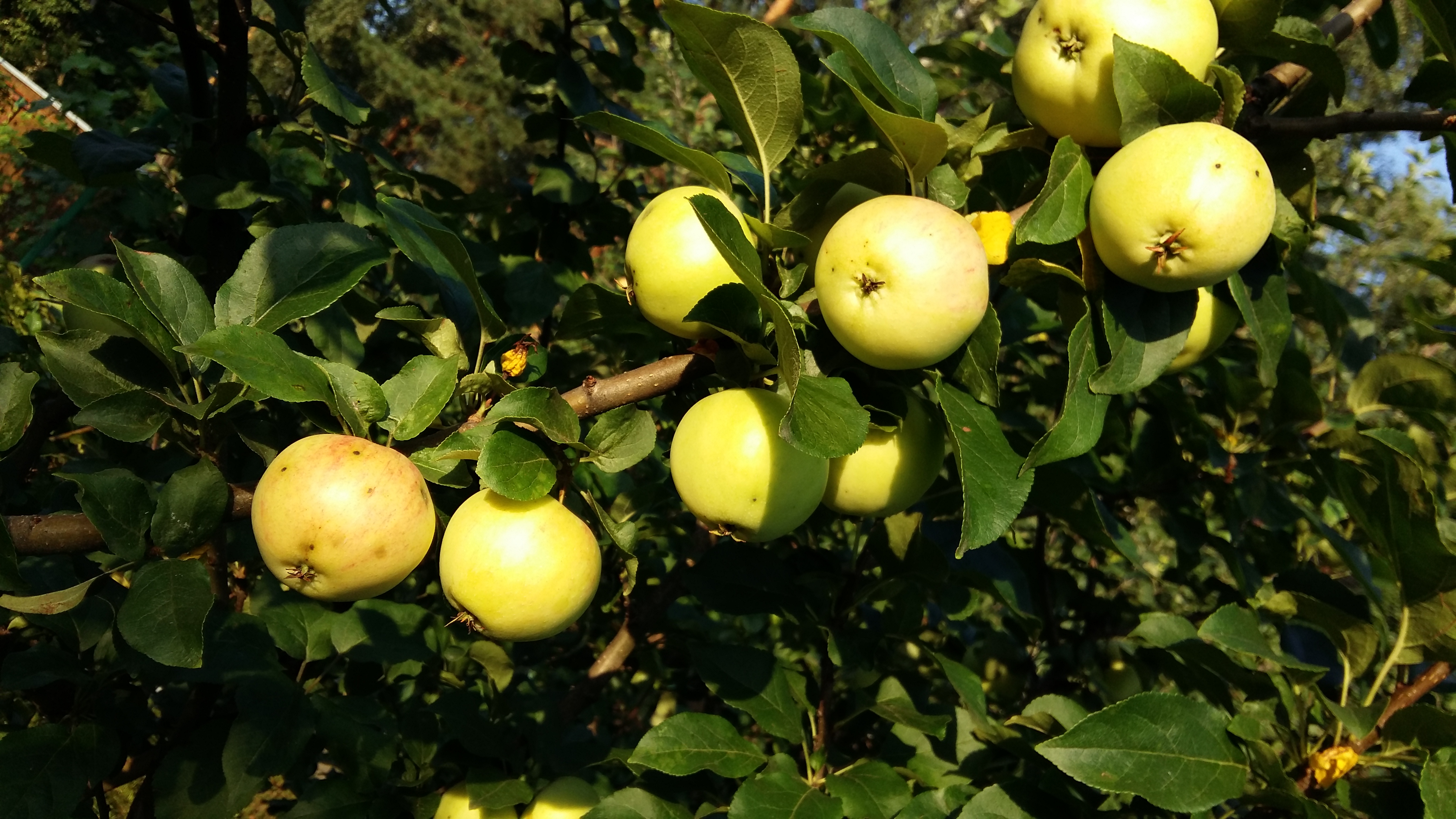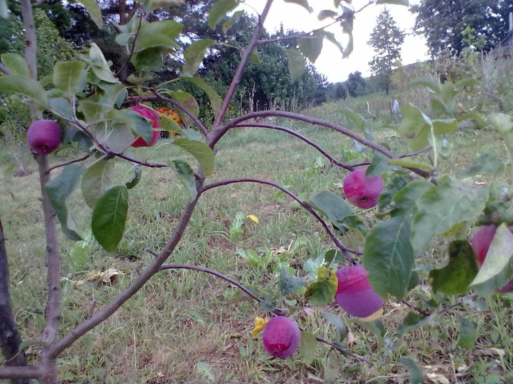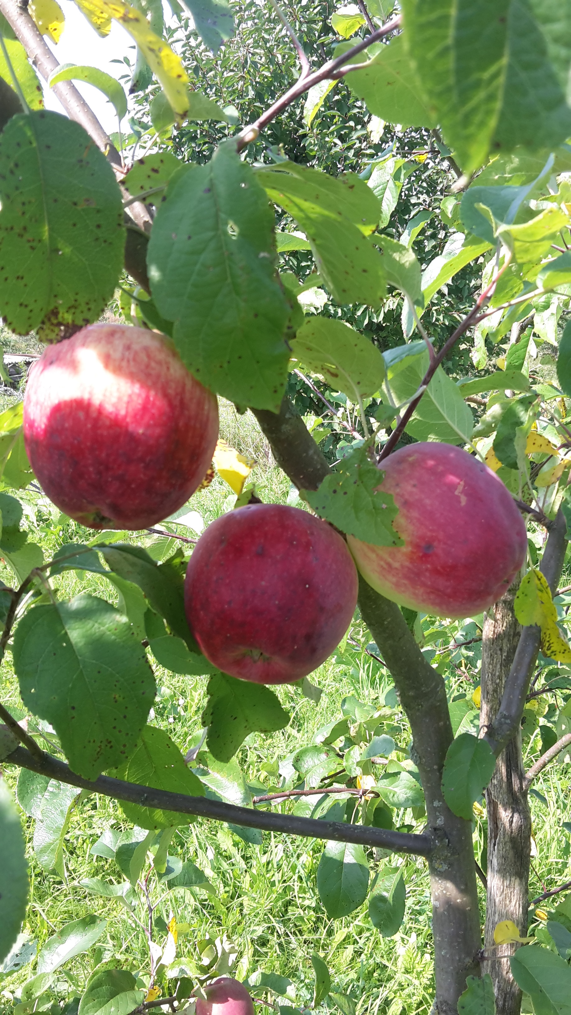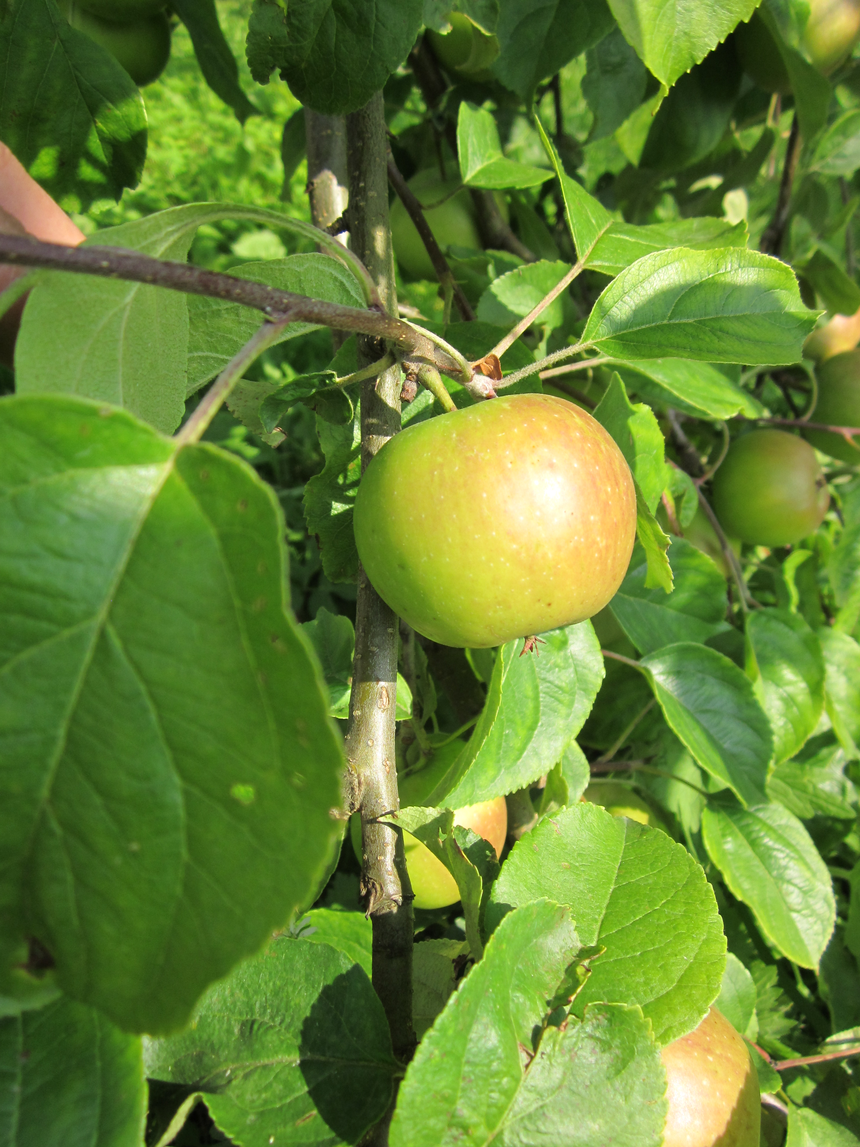 В этом неудачном для яблок году на ветке висят три яблочка, одно попробовала - вкусное, но еще не созрело, на подходе.
