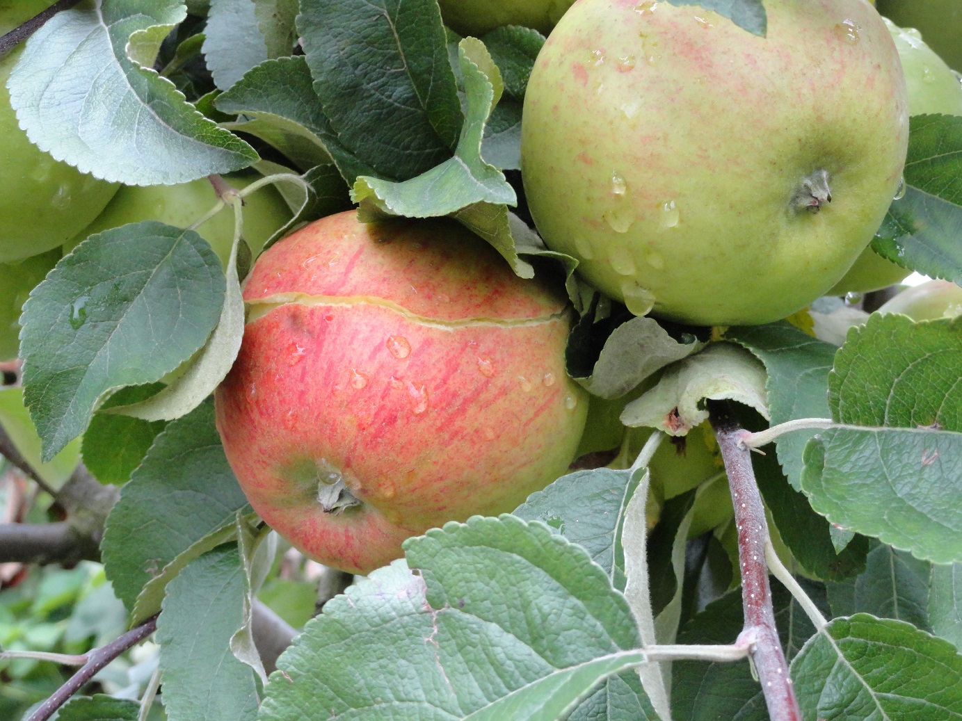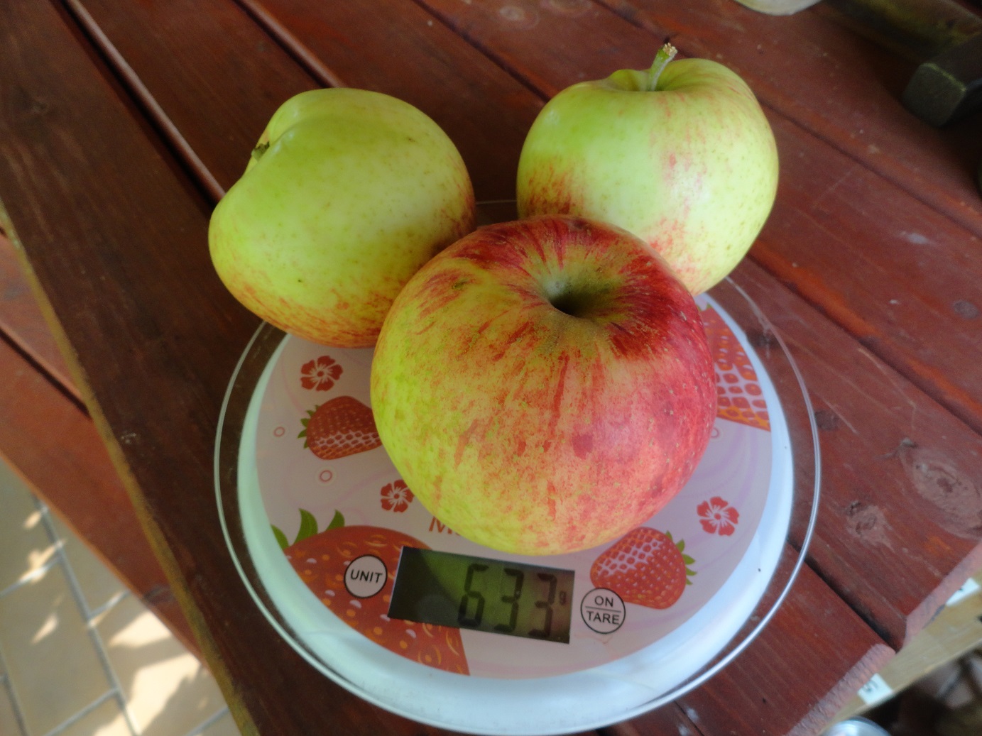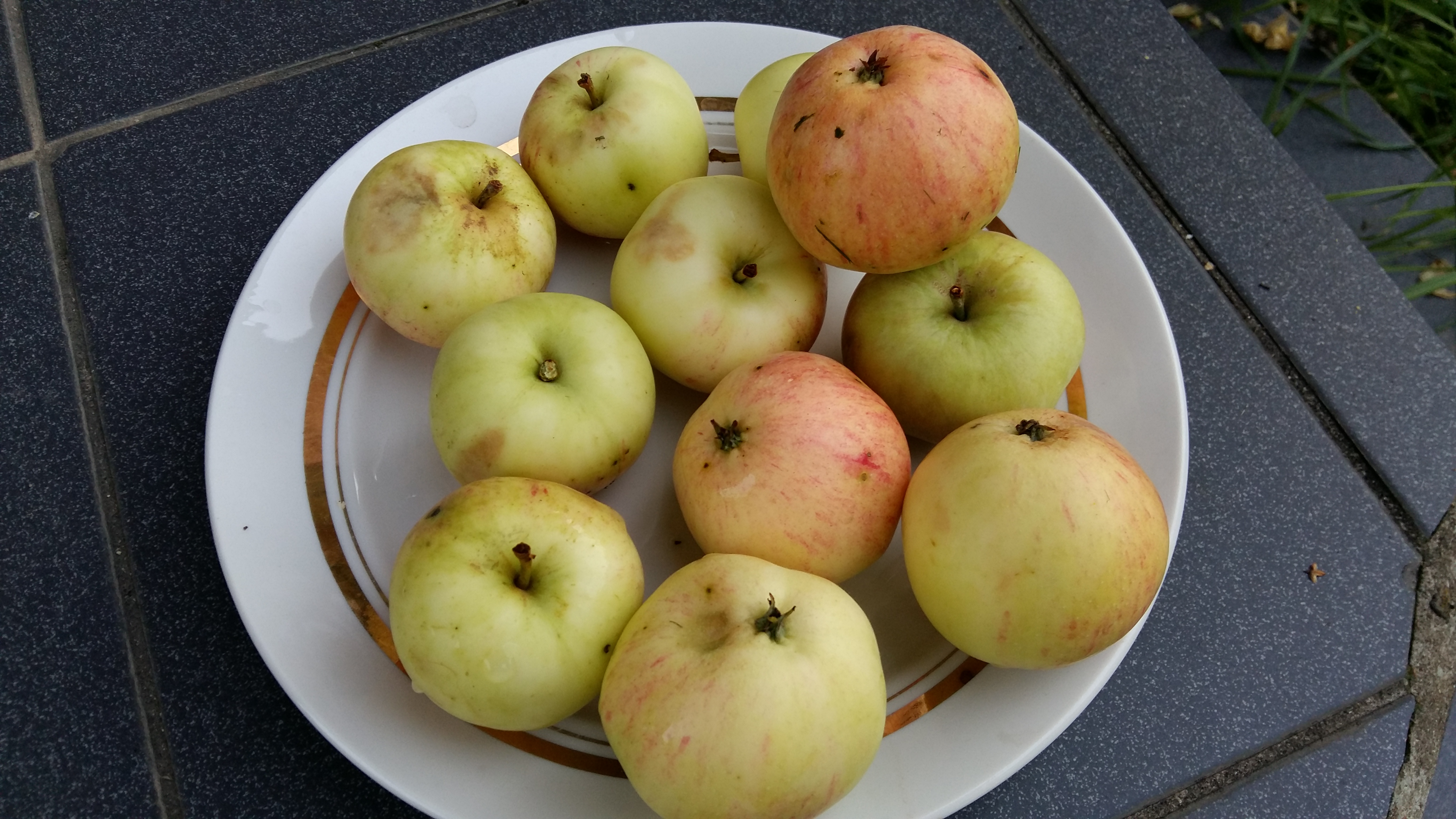 В этом неудачном для яблок году на ветке висят три яблочка, одно попробовала - вкусное, но еще не созрело, на подходе.