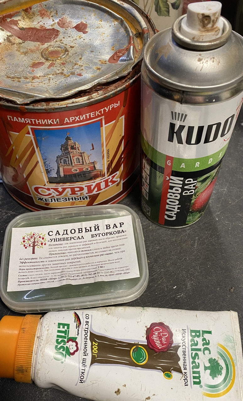 Весной, при основном объёме обрезки, использую железный сурик (на олифе), разбавляется уайт-спиритом до нужной консистенции. Мажу кисточкой. Преимущества - видно где намазал и это- противогрибковое средство.