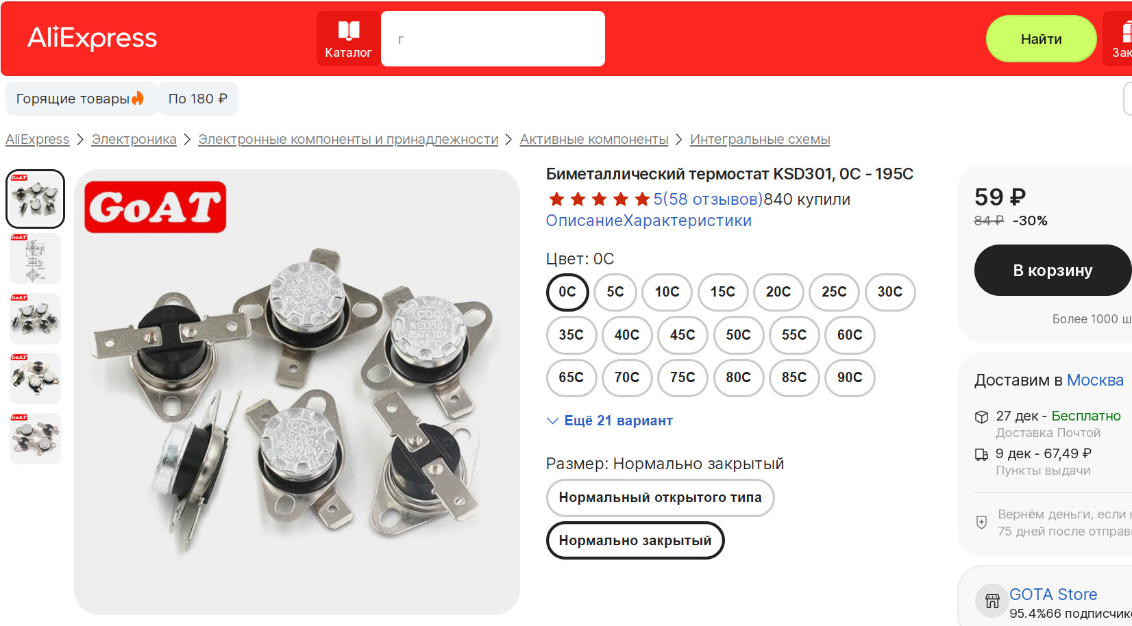 Отзывы на такой термостат неоднозначные, возможен убивающий все разброс параметров, поэтому, с учетом дешевизны, попробую заказать штук 5 на нулевую температуру и штук 5 на 5 градусов. Может, попадется что-то подходящее по температуре и гистерезису, а по месту его размещения я подыграю.