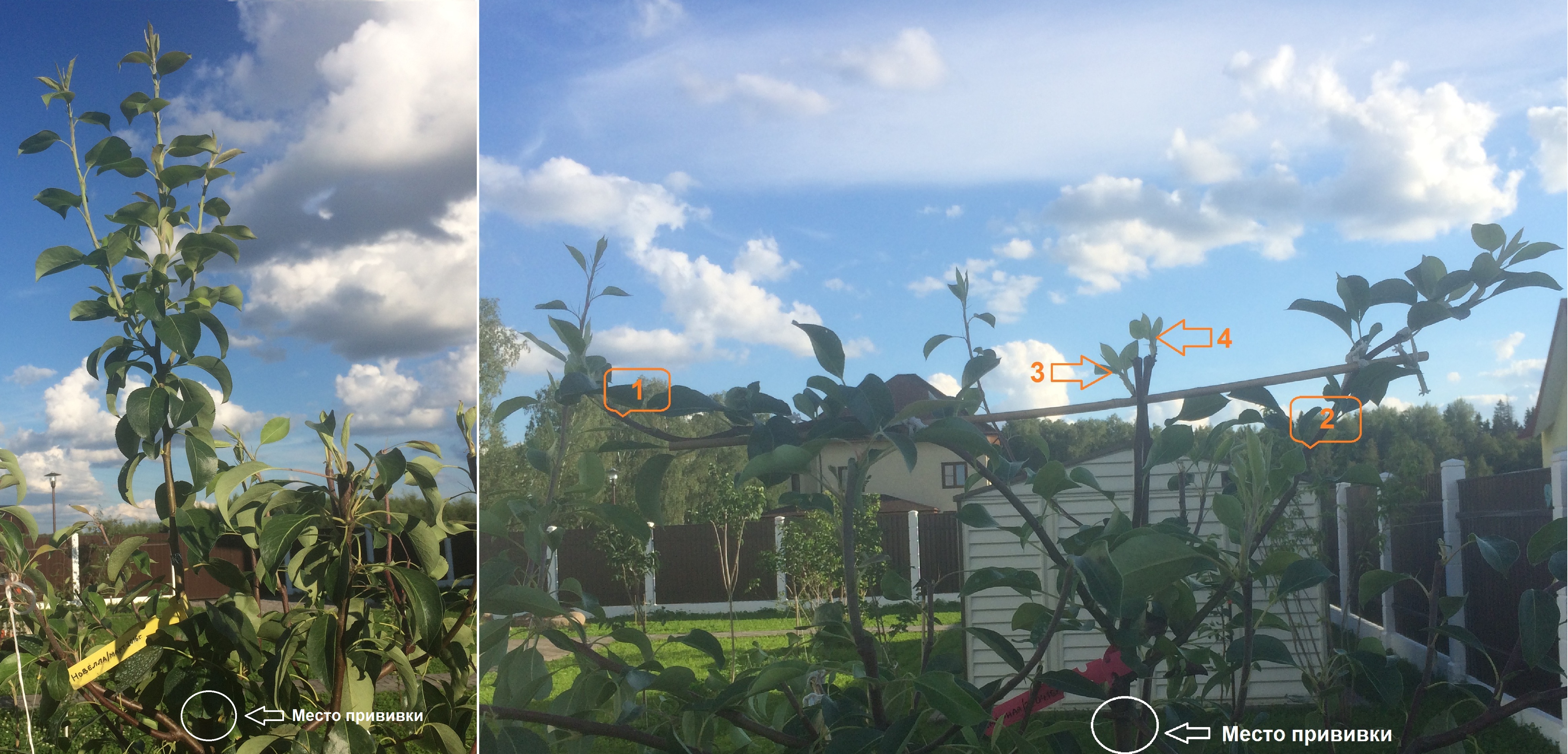 Лучше на живых примерах. Если прививки сделаны в марте - мае, то можно добиться многого. Делал в этом году прививки Мраморной на Скороспелку из Мичуринска и Новеллы на Память Яковлева - это просто ЧУМА! При этом резал их не менее 2 раз каждую. Вообще это делаю рано с прививками текущего года, добиваясь появления нового "первого" яруса и/или ветвления для нового сорта. Как мне кажется в этом один из "секретов" ускоренной закладки плодух и соответственно начала плодоношения - эдакая акселерация... Плодухи закладываются на нижней (обрезанной) части прироста иногда уже в этот год. На левом фото прививка Новеллы сейчас в длину от места прививки до 3-х верхушек побегов 63-65 см. На правом фото Мраморная на памяти Яковлева. Здесь я развел прививку на 4 побега, после чего (дней 15 назад) пару центральных еще раз скорректировал, чтобы побеги 3 и 4 пошли всеже в нужные стороны...
