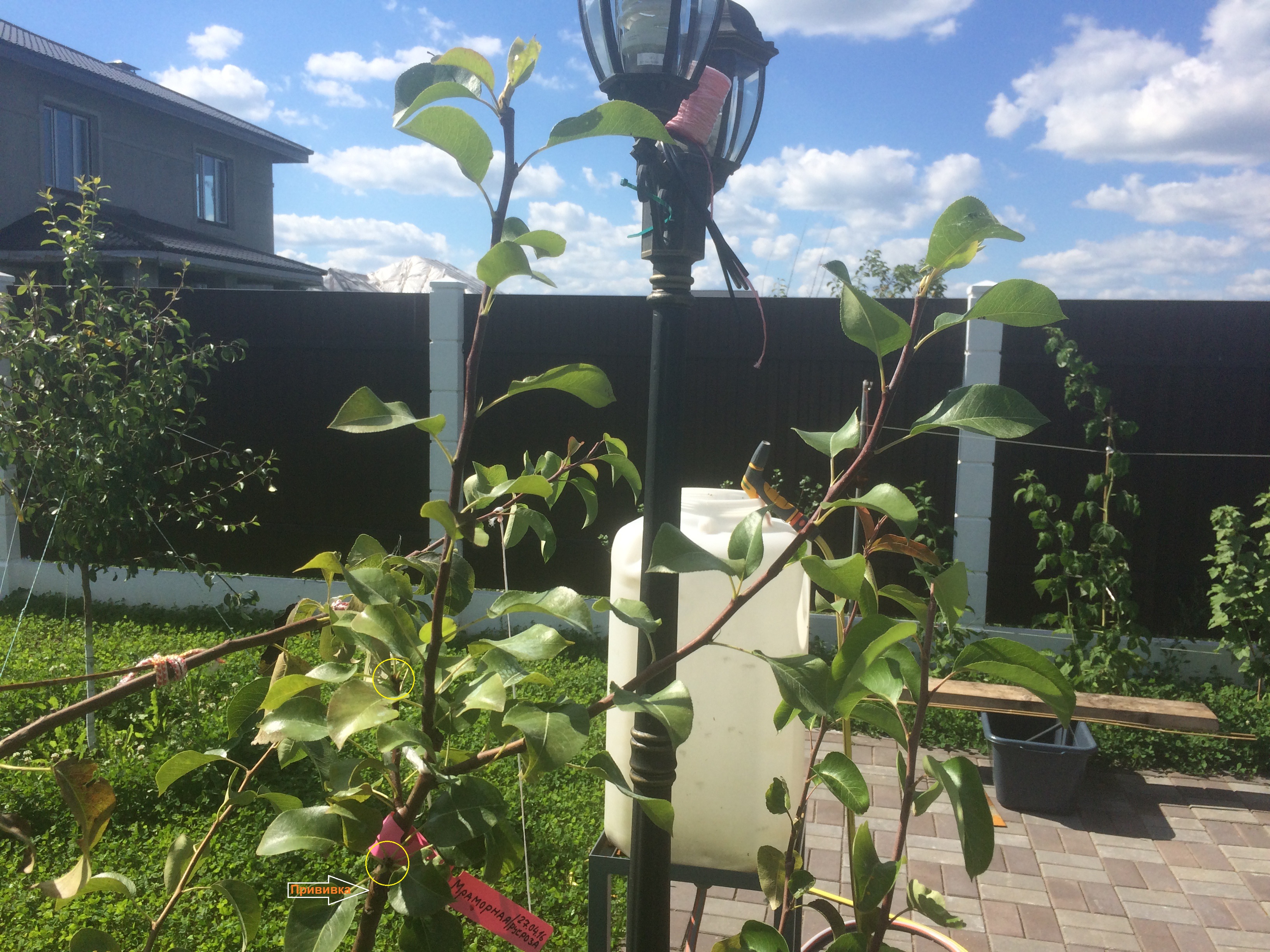 Мне кажется, что столб надо ставить над каждой прививкой, ведь ветер мотает новую крону, её-то и надо подвязывать, а место прививки уж просто дополнительно прихватить, чтобы не вихлялось.