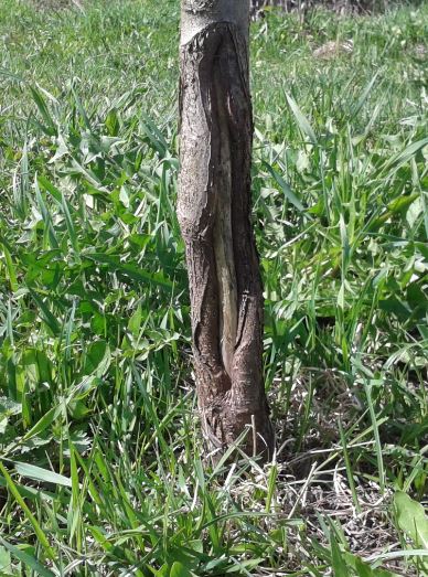 На молодых 2х летних семечковых треснула кора (как на фото). 3 яблони и 1 груша.
