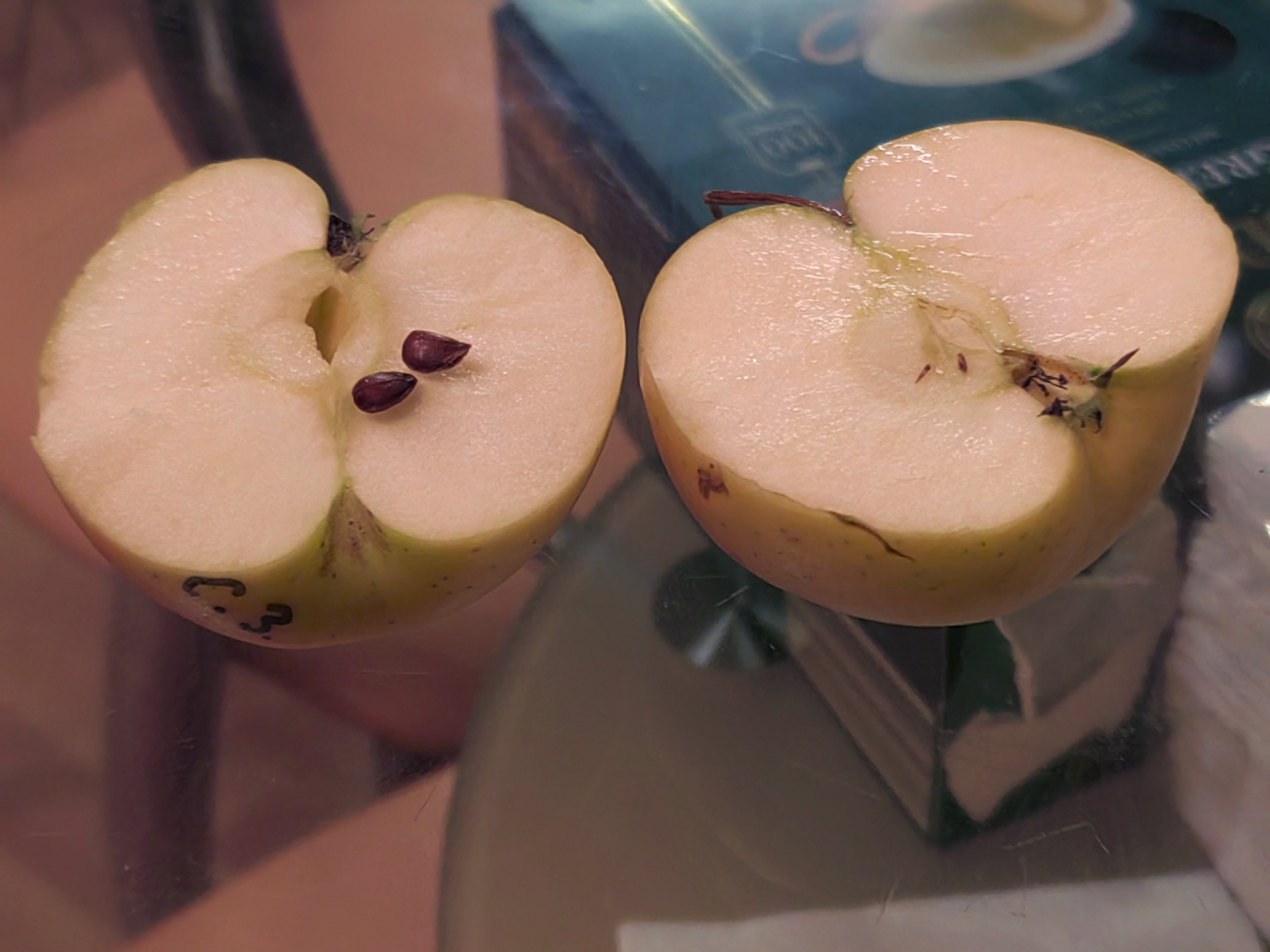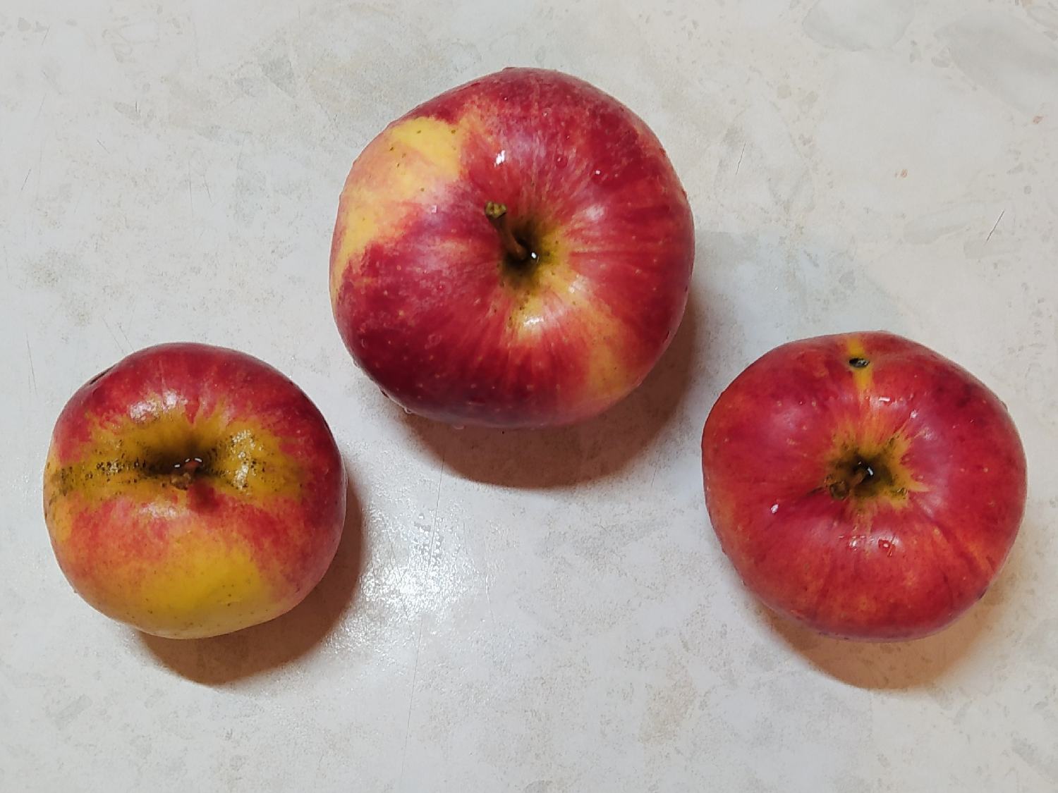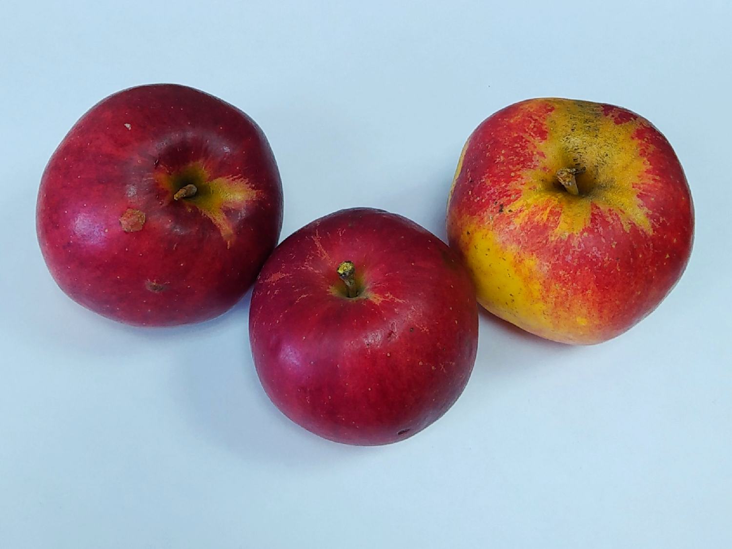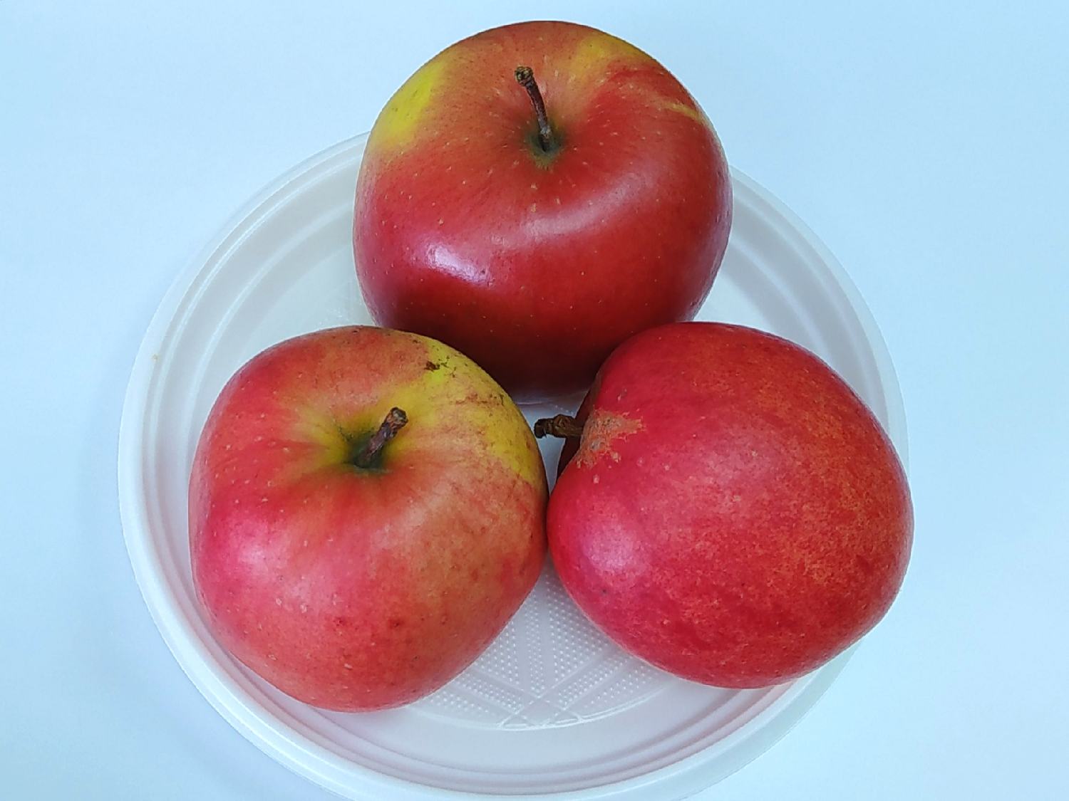 Начну с Райки. К сожалению, не удалось попробовать яблоки в нормативные сроки потребления - пакет с сигналками затерялся и был обнаружен только на днях. Хорошо видна четкая пятигранная форма как у Зорки. Мякоть желтоватая, средней плотности, чуть рыхловатая, среднесочная. Вкус очень хороший, довольно сладкий с небольшой кислинкой. Определенно напоминает родительский сорт Чемпион. Вроде тоже еще оставался, надо устроить им очную ставку.