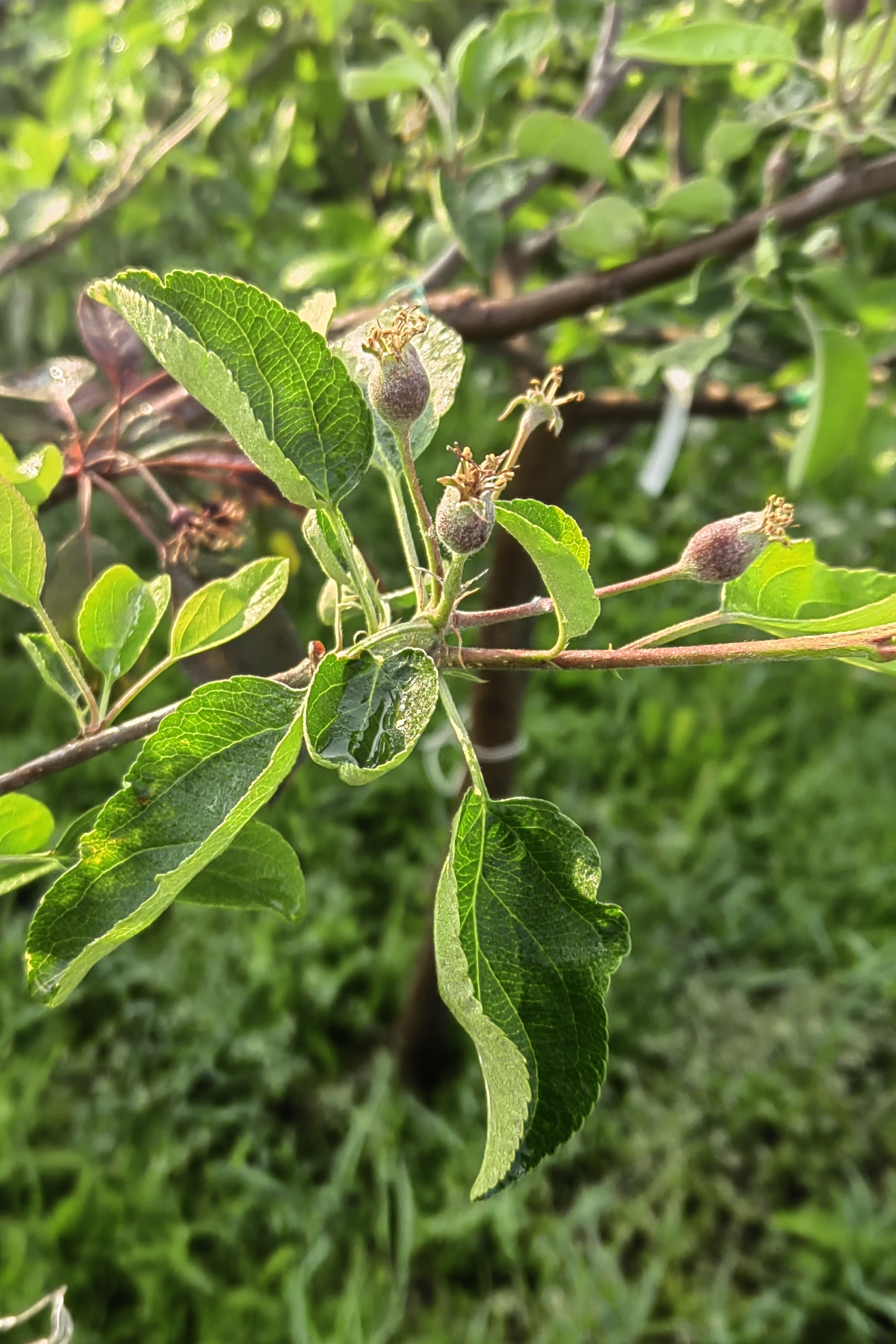 Что же касается Хани Криспа, то мне, к сожалению, достался только очень короткий и тонкий черенок на 10 живых почек с не очень длинными междоузлиями. А привить этот сорт мне хотелось хотя бы на 3 разных деревьях. Поэтому я вынужденно ограничился "одночеренковым" вариантом в верхний зарез и густой замазкой варом среза под ним (в таком варианте вар не способен затечь под кору и повредить прививке).