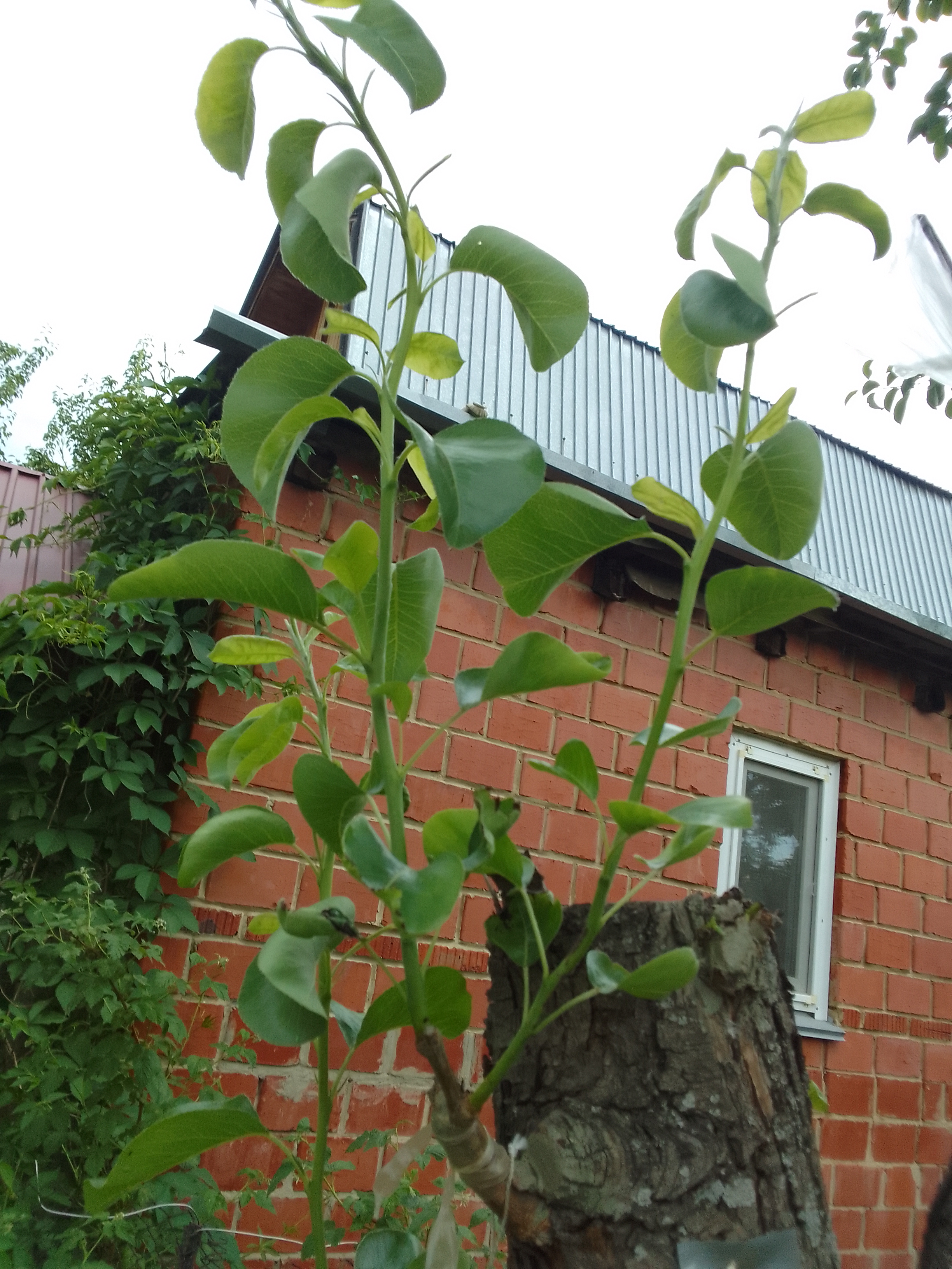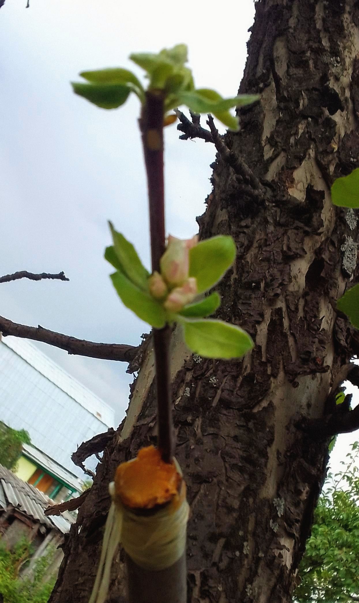 А именно, по грушам - я не знаю, особенность ли это Северянки как сорта или просто моих условий, но на вот таких вот сучках возрастом 3-4 года кора при поднятии буквально "отклеивается" на манер канцелярского стикера. Соответственно, при попытке привить 2 и более черенка существенно увеличивается риск угробить прививаемую ветку целиком. Прививки, кстати, так близко к стволу сделаны по той же причине - сначала я старался сделать их подальше, но 3 раза просто разлохматил подвой в неудачных попытках сделать достаточно маленькие зарезы.