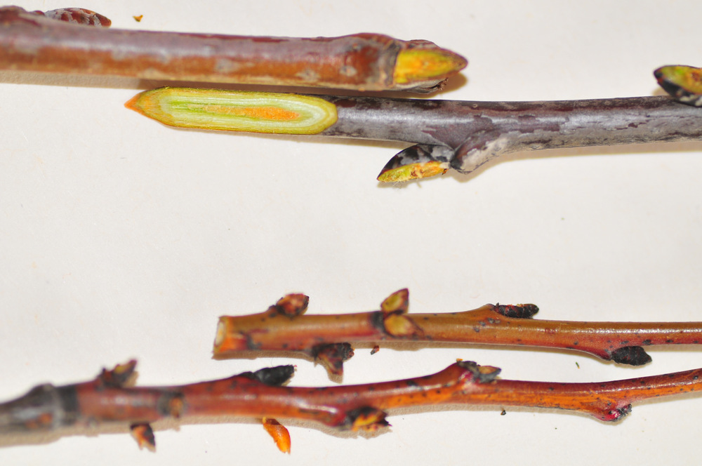 Абрикос Сын Краснощекого (снизу) - повреждений не нашел. Все разрезанные цветочные почки целые.