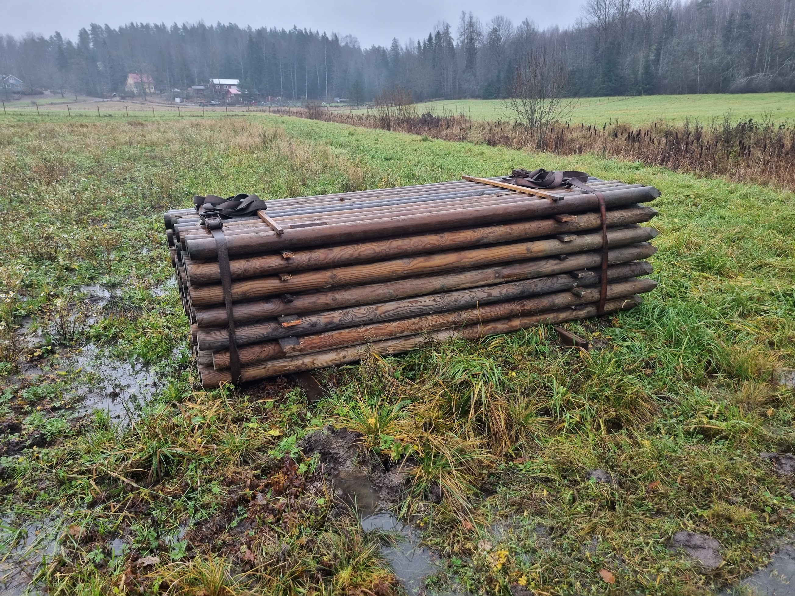 Подвезли импрегнированных столбов для шпалеры 100х3000, 70шт. Кстати, у нас это довольно дорого стоит, и доставка тоже дорогая. Сегодня установил один ряд. Между столбами 9м, забиты на 70см, т.е. высота 2.30, как раз рукой достаю до верха. Сначала бурил отверстие 10см диаметра сантиметров на 30-40 и затем забивал столбы. Якорные столбы 70х1800 забивал под 45 градусов.