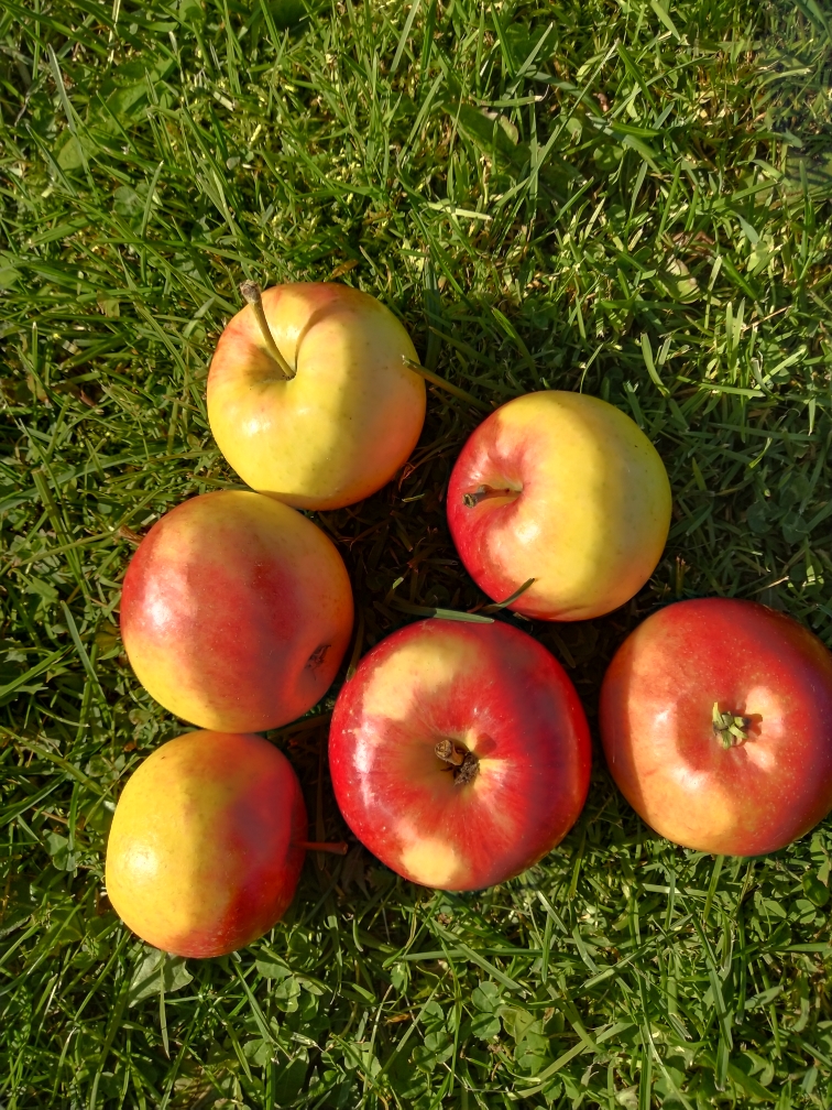 В прошлые выходные снял первый урожай Сноусвит (Snow Sweet, SnowSweetTM). Говорю "урожай", потому как для первых сигналок яблок довольно много. Внешним видом походят на недозревшую Зорку, только без ребер и намного крупнее. Эталонного окраса, как на сайте оригинатора, у меня пока не получилось, хотя многие сорта в моих условиях окрашиваются очень хорошо. Плодоножка у большинства плодов толстая и короткая, яблоки сидят на ветках как плоды облепихи. В Миннесоте созревают в середине-конце октября. Я не стал тянуть со сбором по двум причинам. Во-первых, яблоки уже довольно легко отделялись от веток. А главное - в прошлую зиму дерево заметно подмерзло, решил дать ему побольше времени на подготовку к следующей зиме. Дегустировать ещё рано, по описанию сорт может храниться до начала весны. Попробовал ранее лишь одно яблоко, поврежденное птицами. Впечатляет даже незрелое. Главная особенность - место среза долго не темнеет. Сорт сравнительно новый (2006), в родителях Sharon и Connell Red.