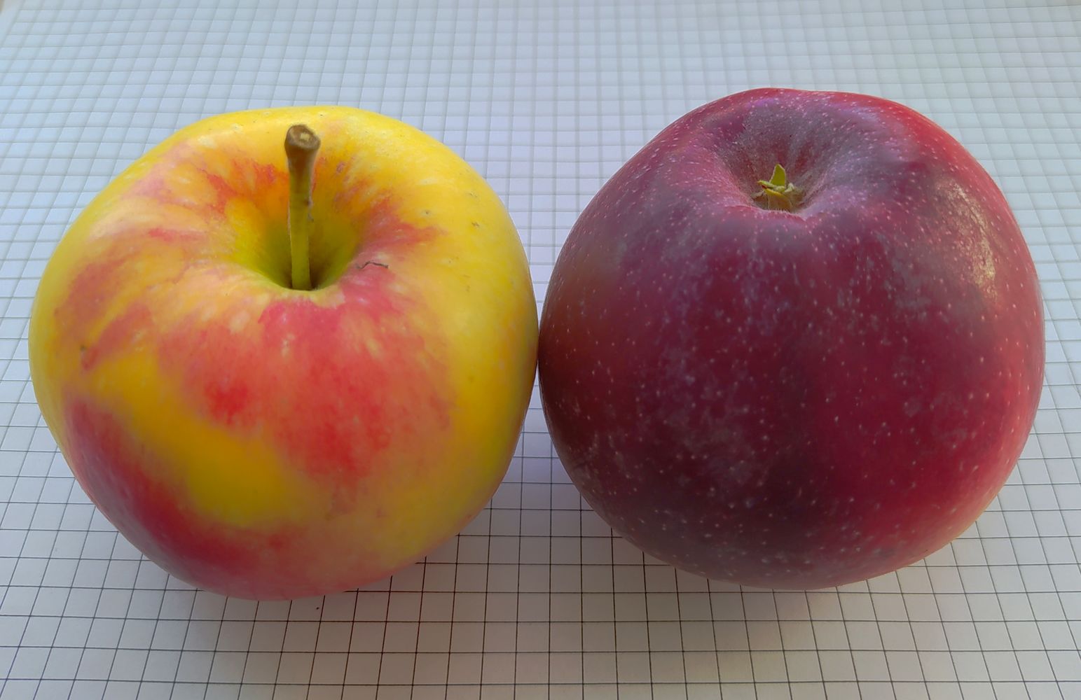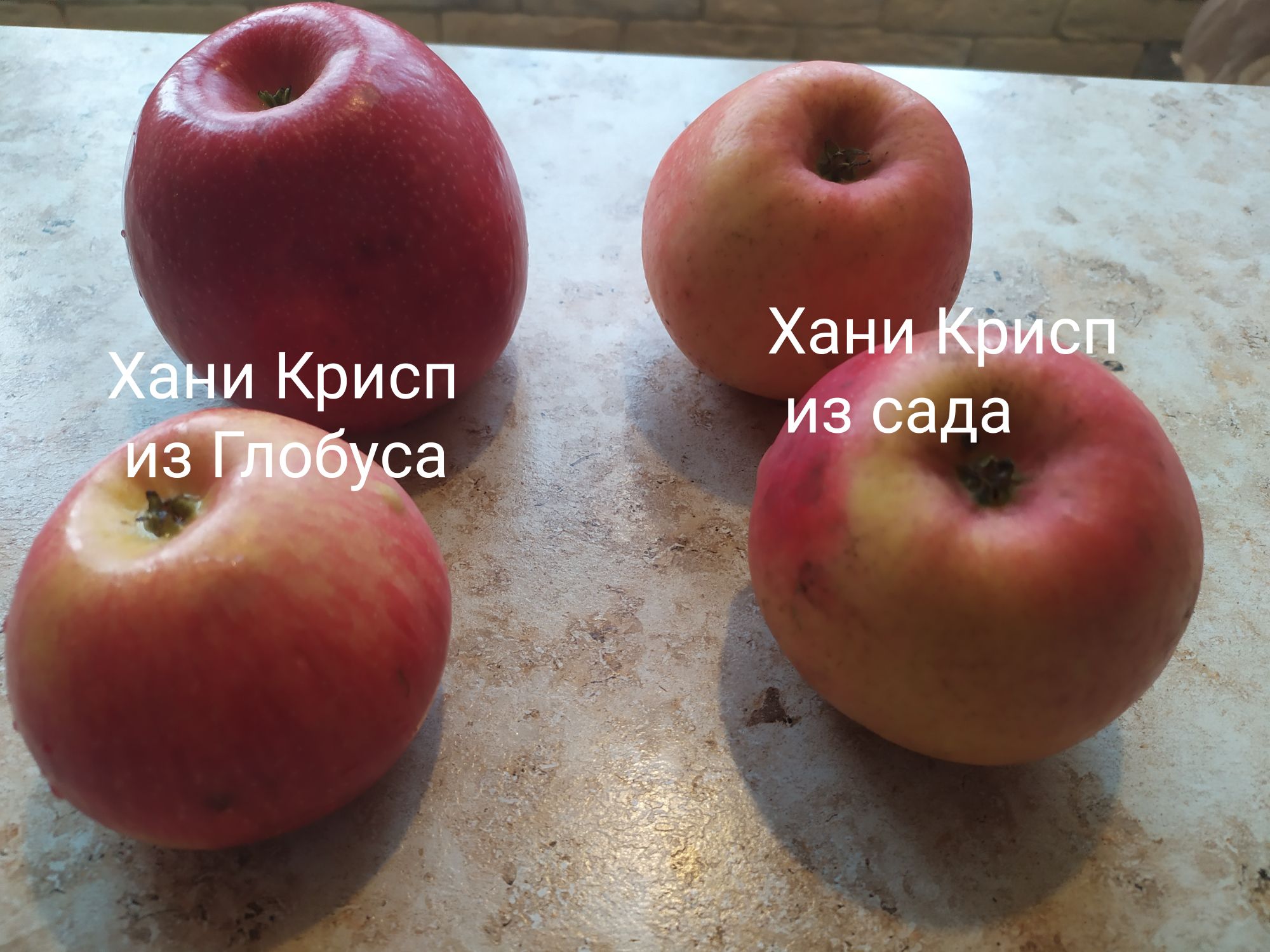 На другом форуме есть мнение, что красный — это Хани Кранч (Honey Crunch), европейская разновидность американского сорта Honey Crisp. Сложно спорить, ведь он и пришел к нам из Польши, через Беларусь и Украину; в отличии от полосатого, что приехал напрямую, из Штатов.