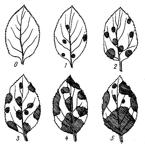 Шкала для оценки стойкости сортов яблонь груш к парше: 0, 1, 2, 3, 1, 5 — баллы поражения