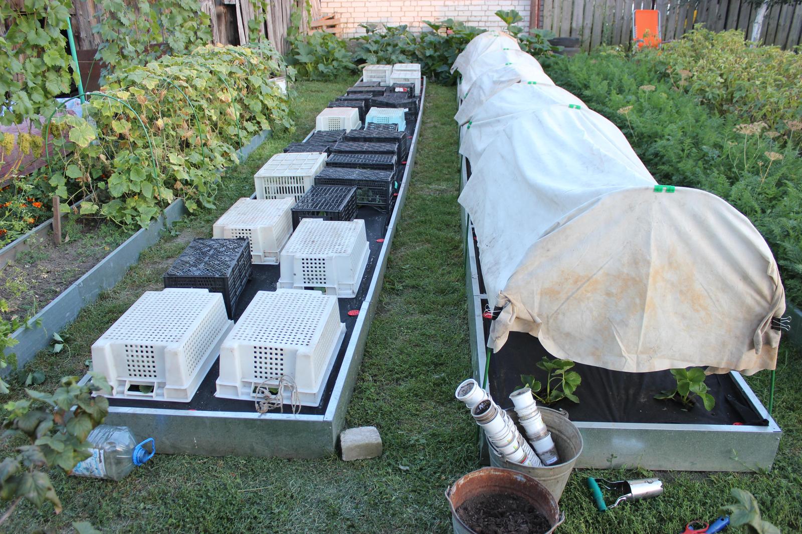 Сделал вчера большое дело. Посадил две грядки земляники. Сначала постелили черный спанбонд, разметили и высадили. Жара адская, поэтому несмотря на то, что рассада ЗКС, очень качественная, сделал притенение. На фото два варианта, которые я использую. Ящиками быстрее, но такого количества у меня просто нет. В таком виде грядочки недельку постоят, акклиматизируются.