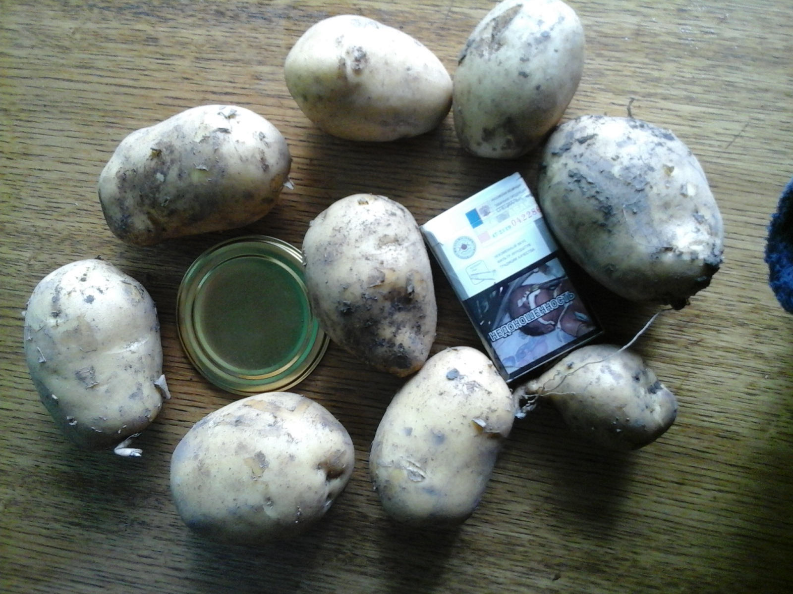 Выкопала куст Джелли. Картофель - супер ! А ведь ему расти еще месяц, минимум.Коробка спичек не нашла дома, для сравнения - обычная консервная крышка, ну и .. (курить вредно )))