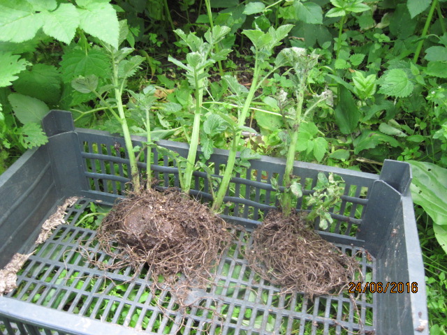 Был сегодня в деревне и как и обещал произвел пробную копку. Обычно начинаю копать с самых слабых и больных кустов. Выбрал по кустику Лиги и Очарования. И вот что получилось (сверху Лига)