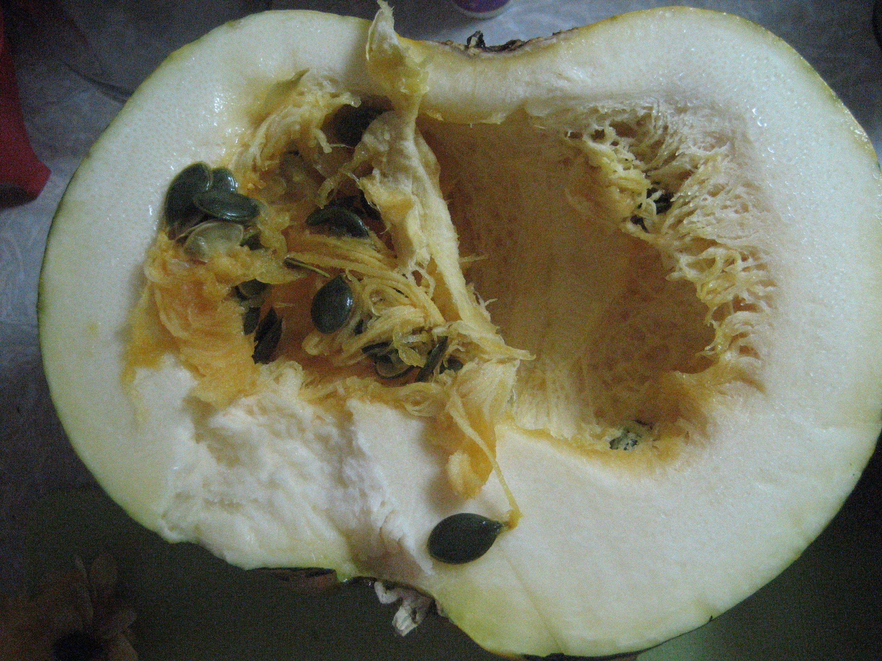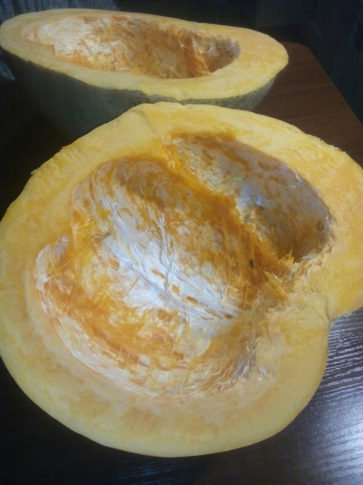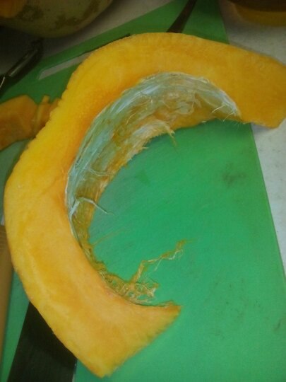 Сегодня вскрыли Тыкву. Вкусная, даже сладкая, шкурка тонкая , семечки не проросли . Была в одном месте стукнута (наверно) см. фото 2 но внутри не загнила не испортилась (см фото 1).