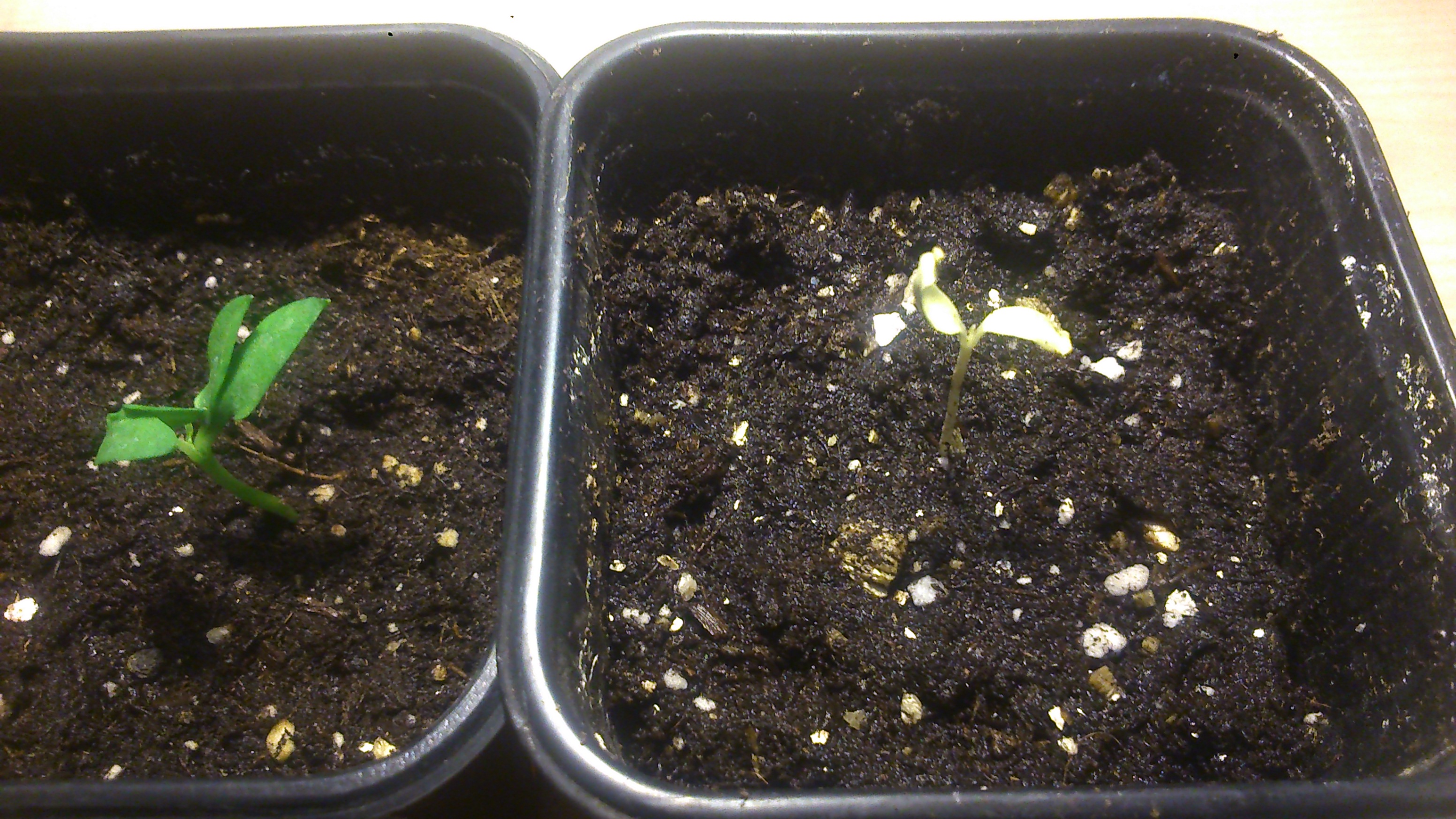 Есть у меня два горюшка. Один с раздвоенными семядольными листьями, а другой желтый, как осенний лист. И чего с ними не так? ( Корневая у второго не плохая, я его сегодня потрошила)