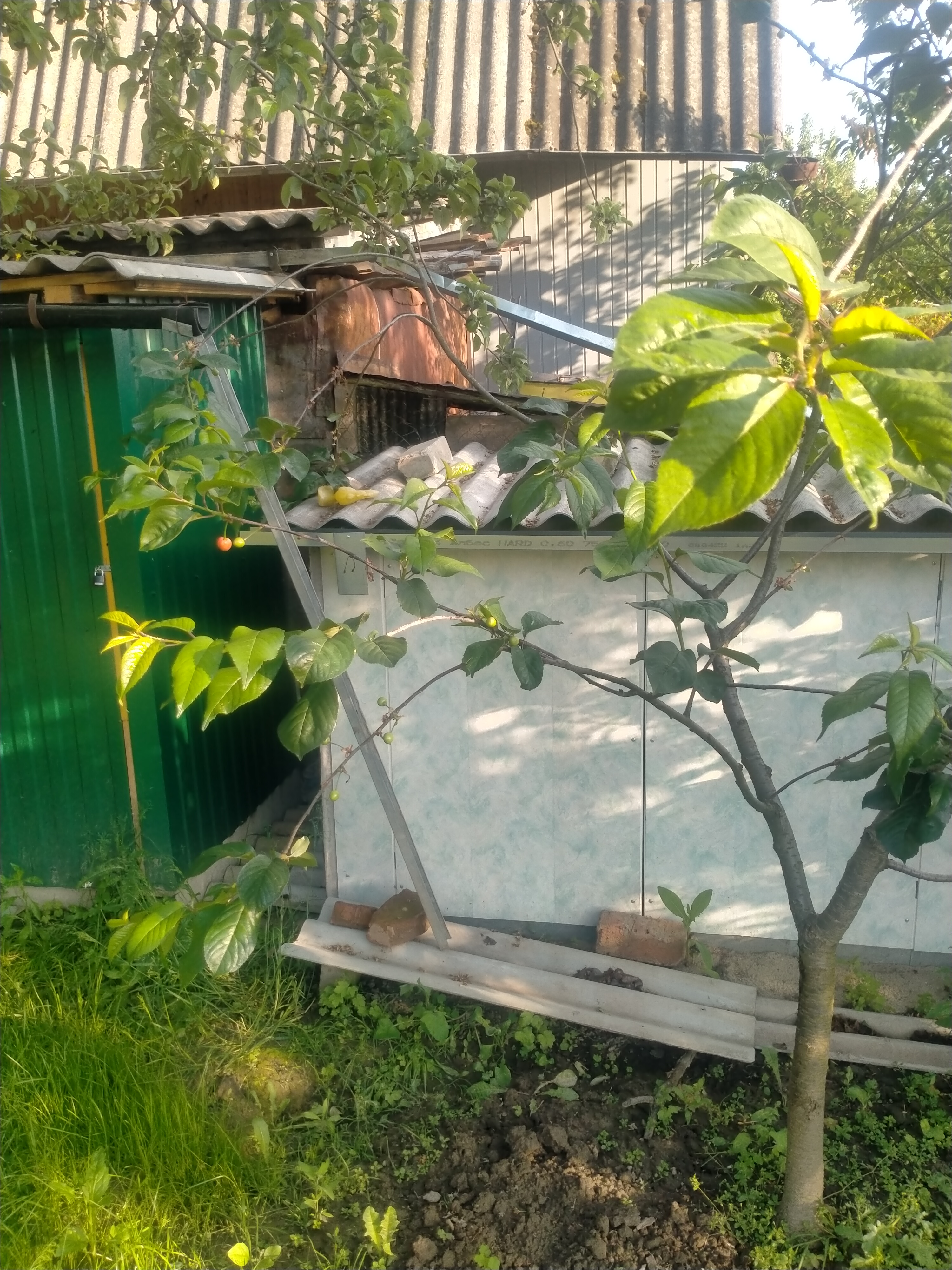 Очень вкусная, но уже много лет неразвивающаяся вишня с десятком плодов. Женская часть семейства по причине вкусности плодов против удаления.