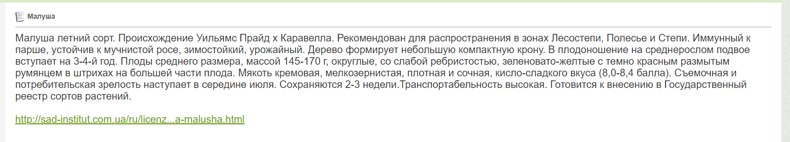 В 21 году привил в крону старой летней яблони украинские летние сорта Настя, Малуша, Паланка (черенки от Ольховича). Настя 40-градусных морозов не перенесла, остальные пережили. Конечно, с повреждениями, но этом году уже было около 30 яблок Малуши и несколько штук Паланки. Чем Паланка отличается от Малуши я так и не понял - и выглядят одинаково (и плоды и листья) и вкус одинаков и сроки, - поэтому буду дальше в основном про Малушу, которую получше распробовал, т.к. её было побольше. В общем - урожайность очень высокая, не менее половины я отнормировал в июне и это ещё сильно жадничал, оставляя по 2 плода в соцветии, поэтому и вес скромный вышел в среднем 120 гр, но были и по 150 гр. Падать яблоки стали уже в середине июня, ещё не зрелые. Уже тогда вкус был хороший, сладкий с небольшой кислинкой, мякоть плотная, сочная. При этом семечки ещё белые были. При дальнейшем созревании сладости становится побольше, кислинка совсем пропадает, вкус становится чисто сладким, мякоть при этом теряет плотность. Где-то в последнюю неделю июля был оптимальный вкус, сейчас ещё остались последние яблоки, но мякоть уже рыхловата. Я их не пытался ещё хранить, срывал, или собирал под деревом постепенно. Осыпаемость, кстати, я бы охарактеризовал как среднюю, некоторые осыпались незрелыми, но были яблоки, которые при сильных дождях с ветрами висели до перезревания. В следующем году думаю в начале созревания надо будет всё оборвать и в холодильник.