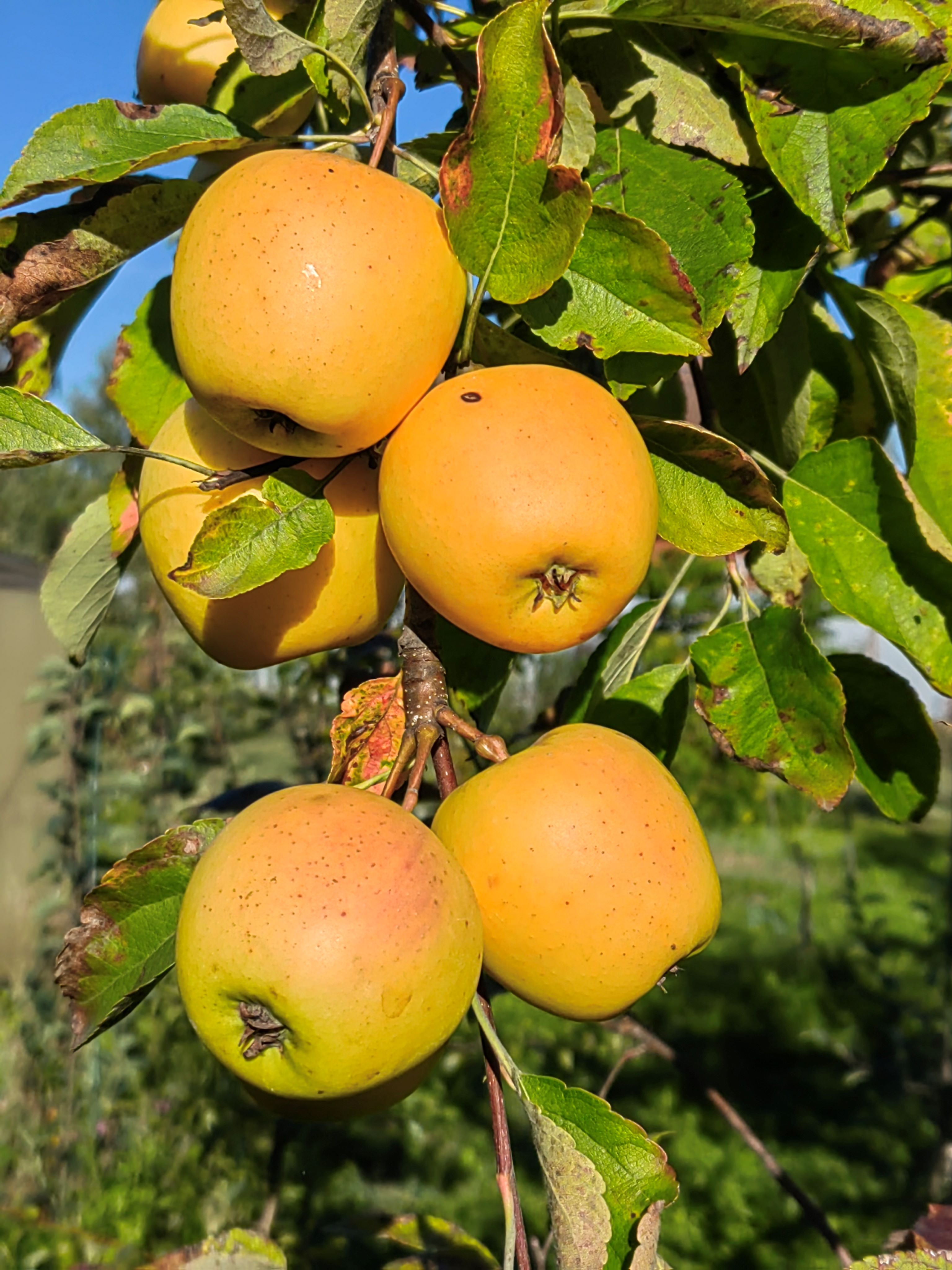 Хани Голд ещё не сняли (на фото). Сезон сухой, одной стандартной обработки в марте бордосской хватило, чтоб не было парши на листьях.