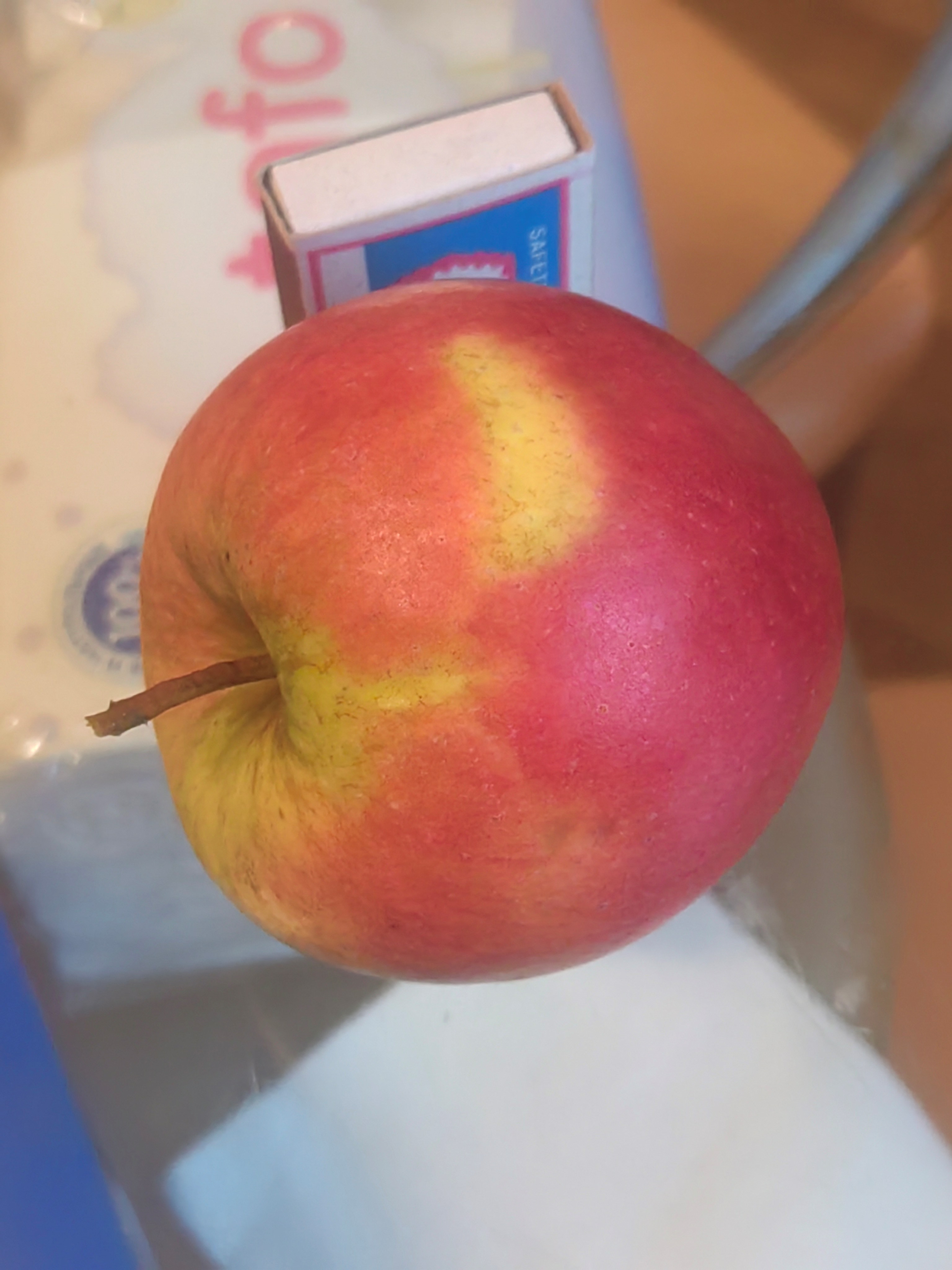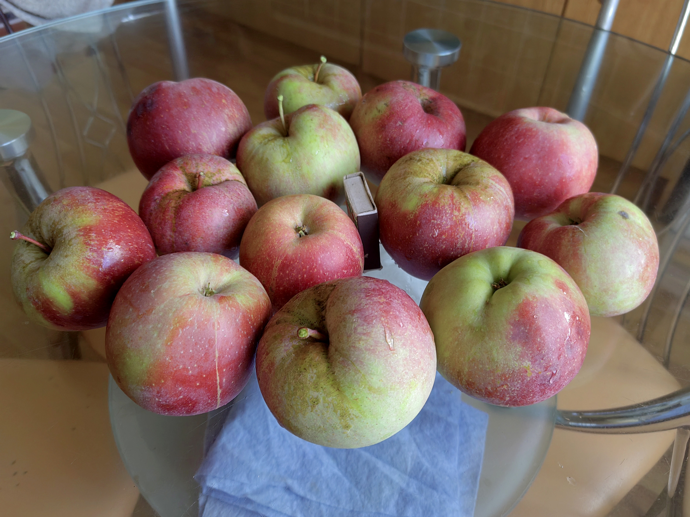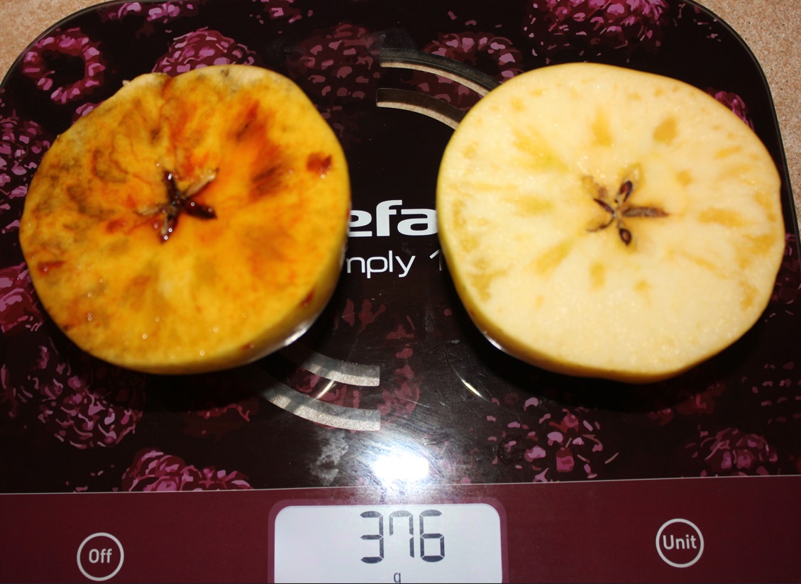 Макинтош, сигналки на Папировке, один плод упал.Твердое, сочное,сладкое 15бр, снял остальные.Йодный тест аптечным йодом,светлая сторона солнечная.