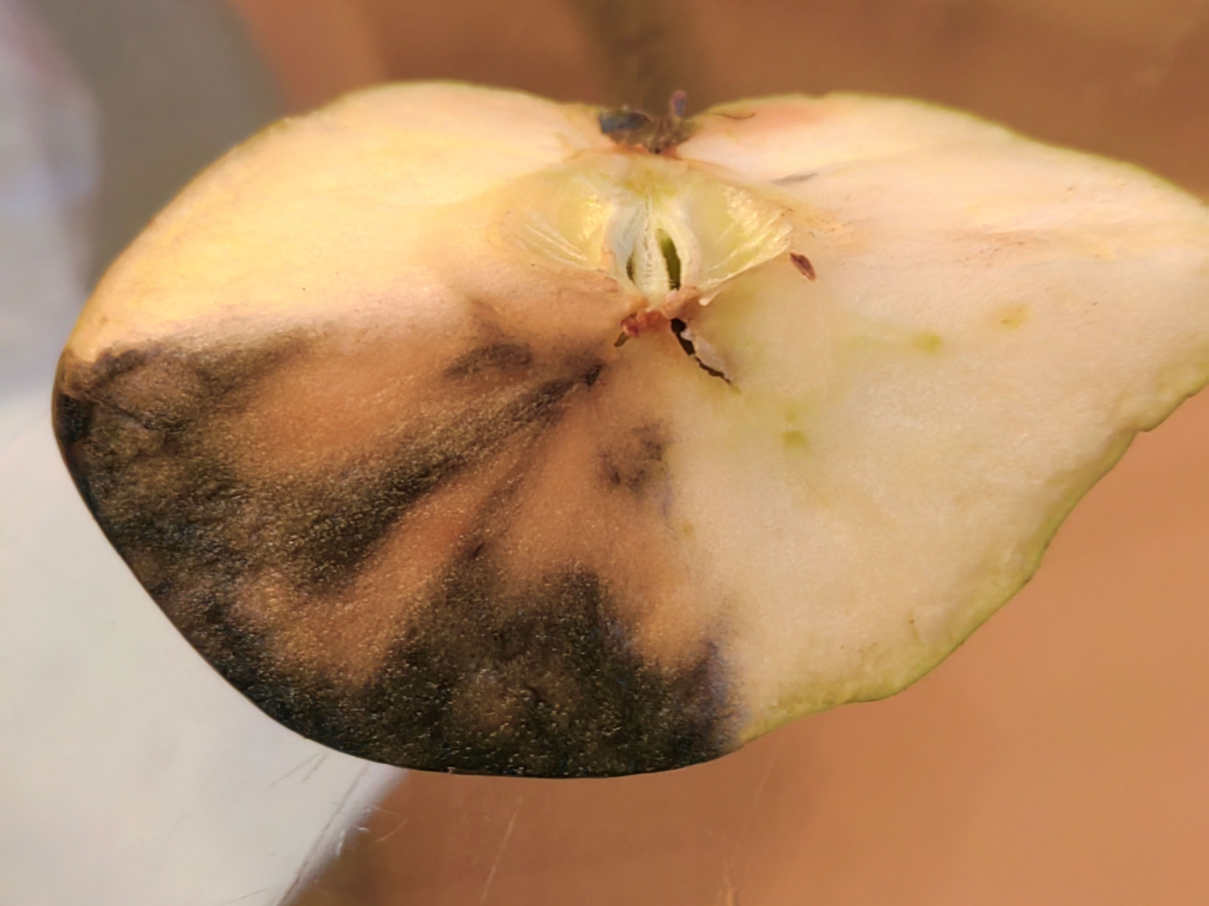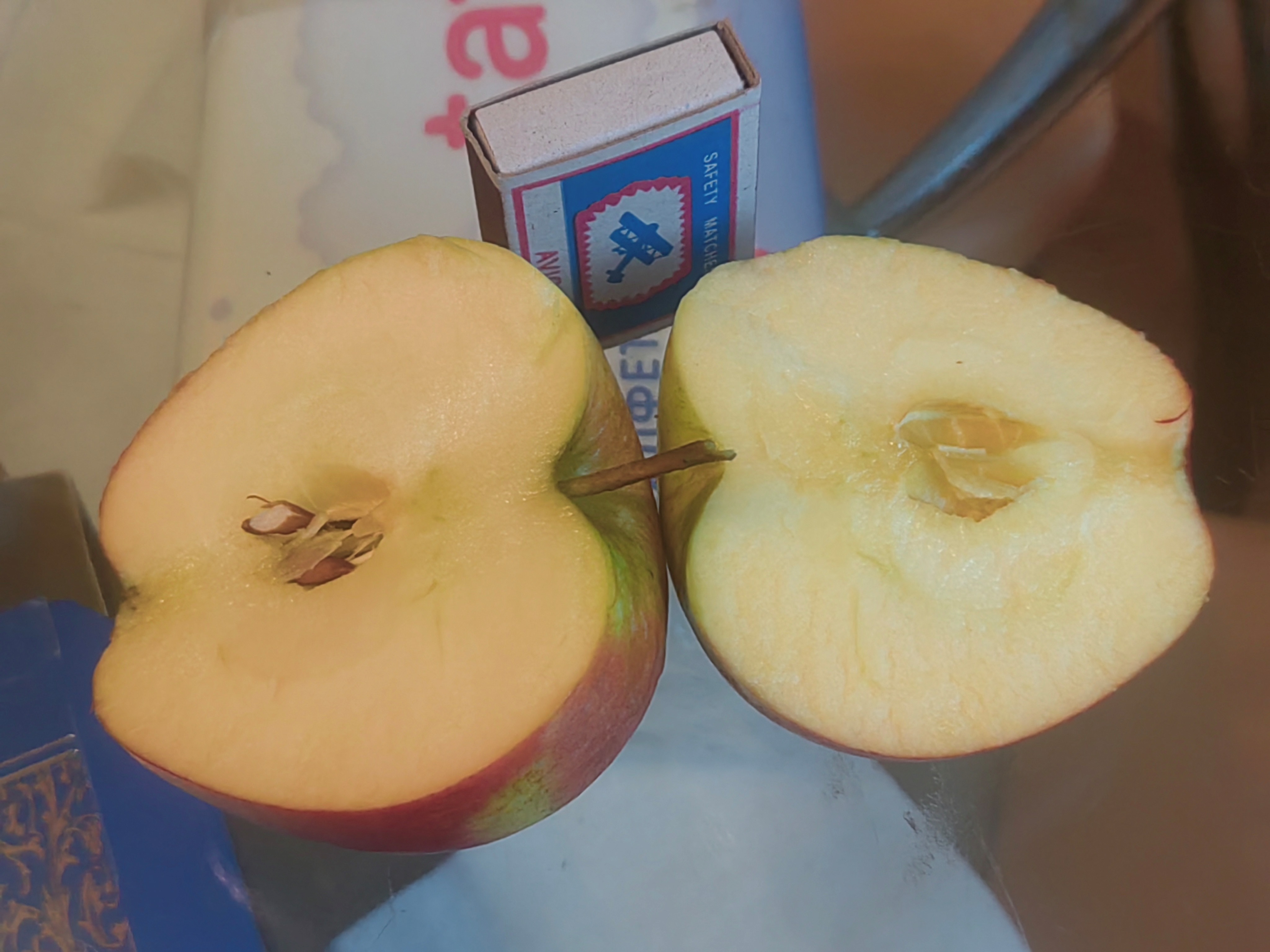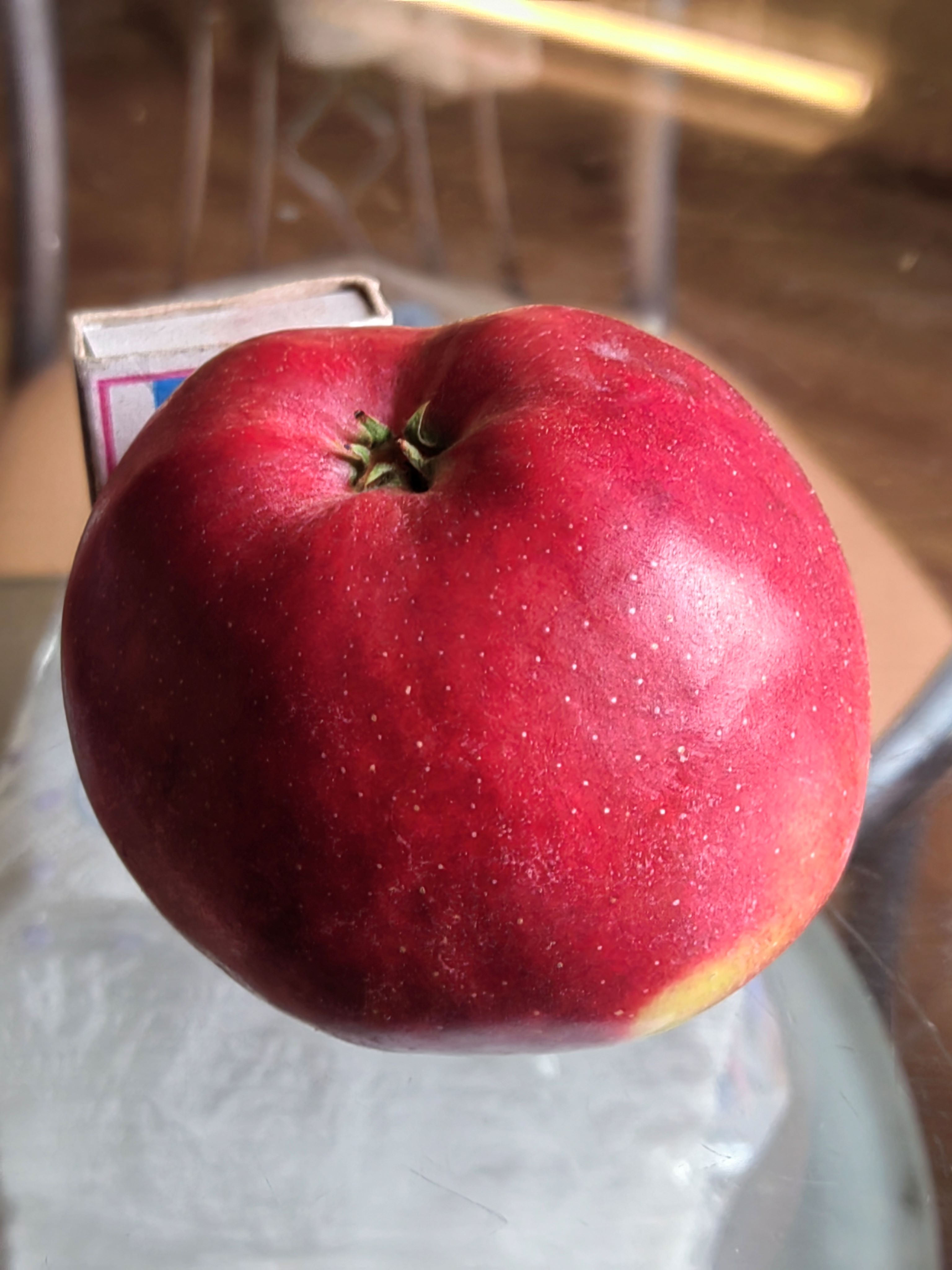 Макинтош, сигналки на Папировке, один плод упал.Твердое, сочное,сладкое 15бр, снял остальные.Йодный тест аптечным йодом,светлая сторона солнечная.
