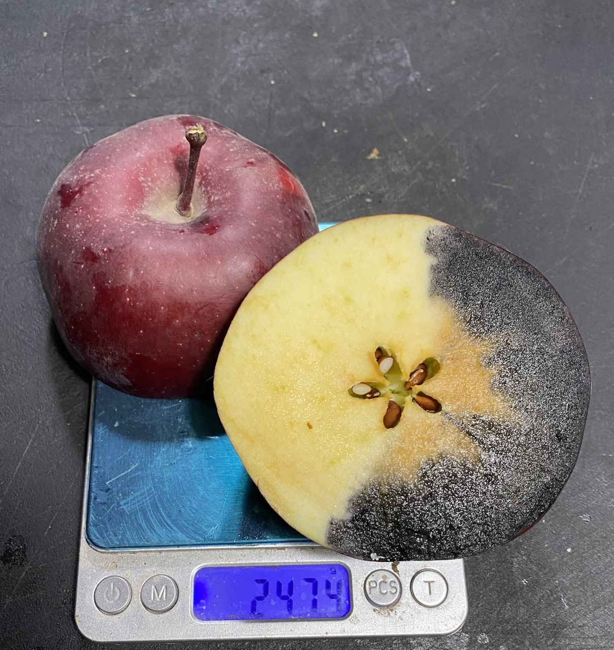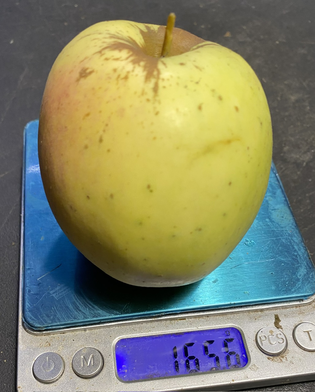 Мутсу в этом году уже созрело. Имеет налив что значительно улучшает вкус этого яблока. Кстати японцы любят такие сорта и даже специально их выводят. Есть небольшой отход по ямчатости но учитывая яблоки такого качества будем работать кальцием. Парша при стандартных обработках на этом сорте не критична. Яблоки чистые.