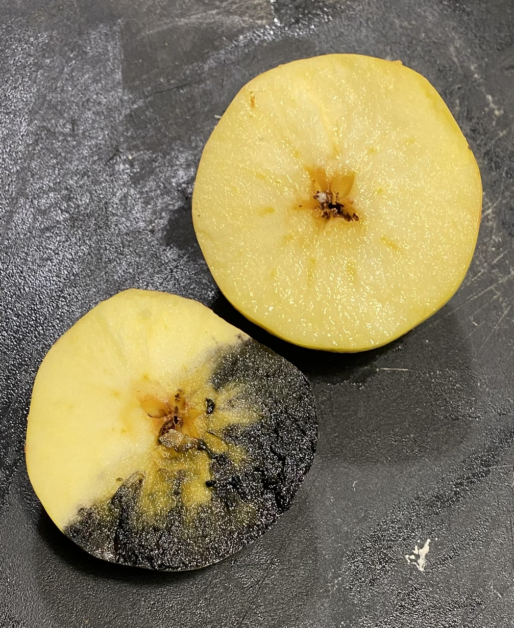 Есть общие характеристики для триплоидного сорта как сильный рост, обычно прививка опережает в развитии и утолщении ветку на которой привита или подвой. Крупные листья, толстые побеги. Также явным показателем являются неполноценные (неразвитые семечки).