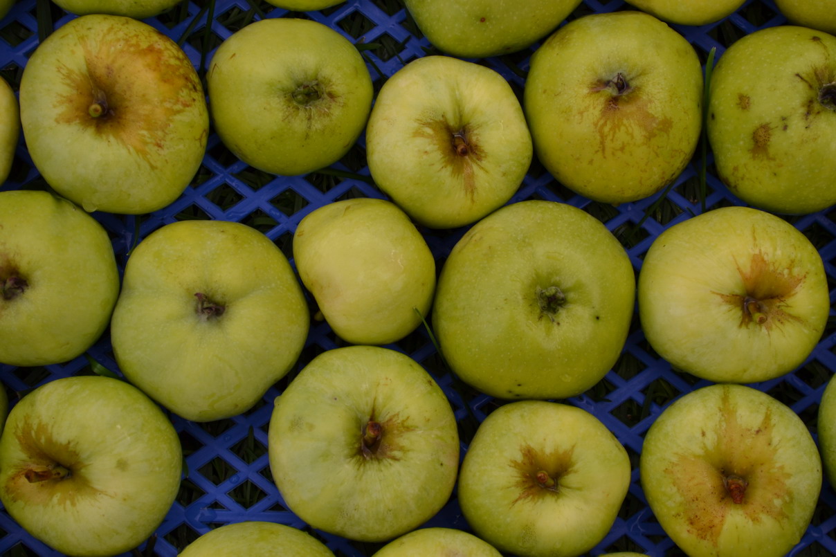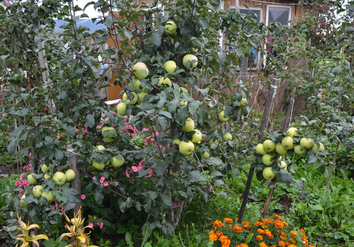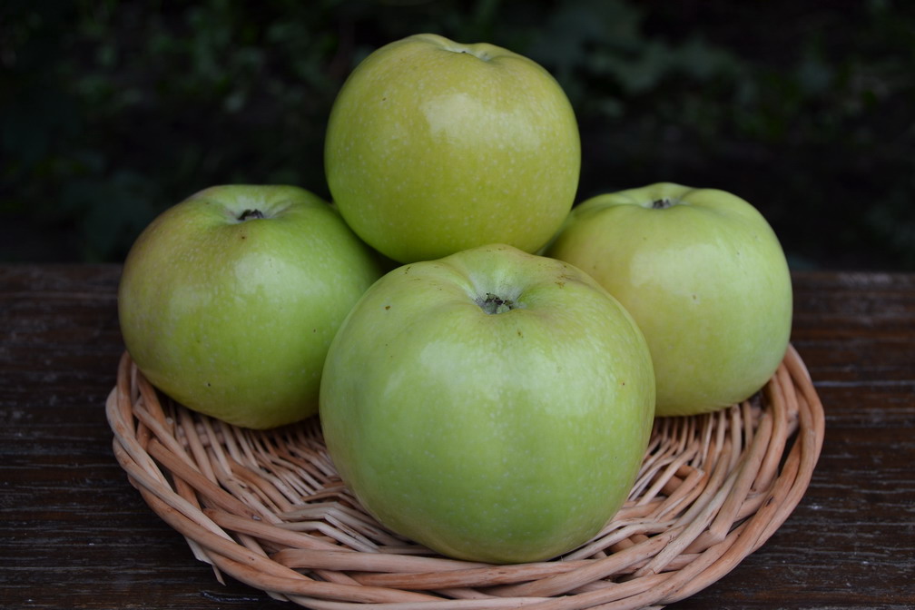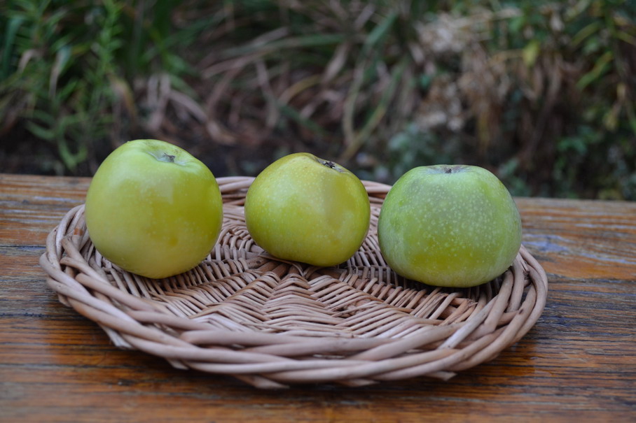 Те что зеленые, зимний сорт, плодоносит ежегодно, в яблочные годы урожайность умеренная, в годы отдыха небольшая, но тем не менее присутствует. Хранится до апреля легко в обычном деревенском подполе. На единичном фото яблоко этого же сорта в конце марта.