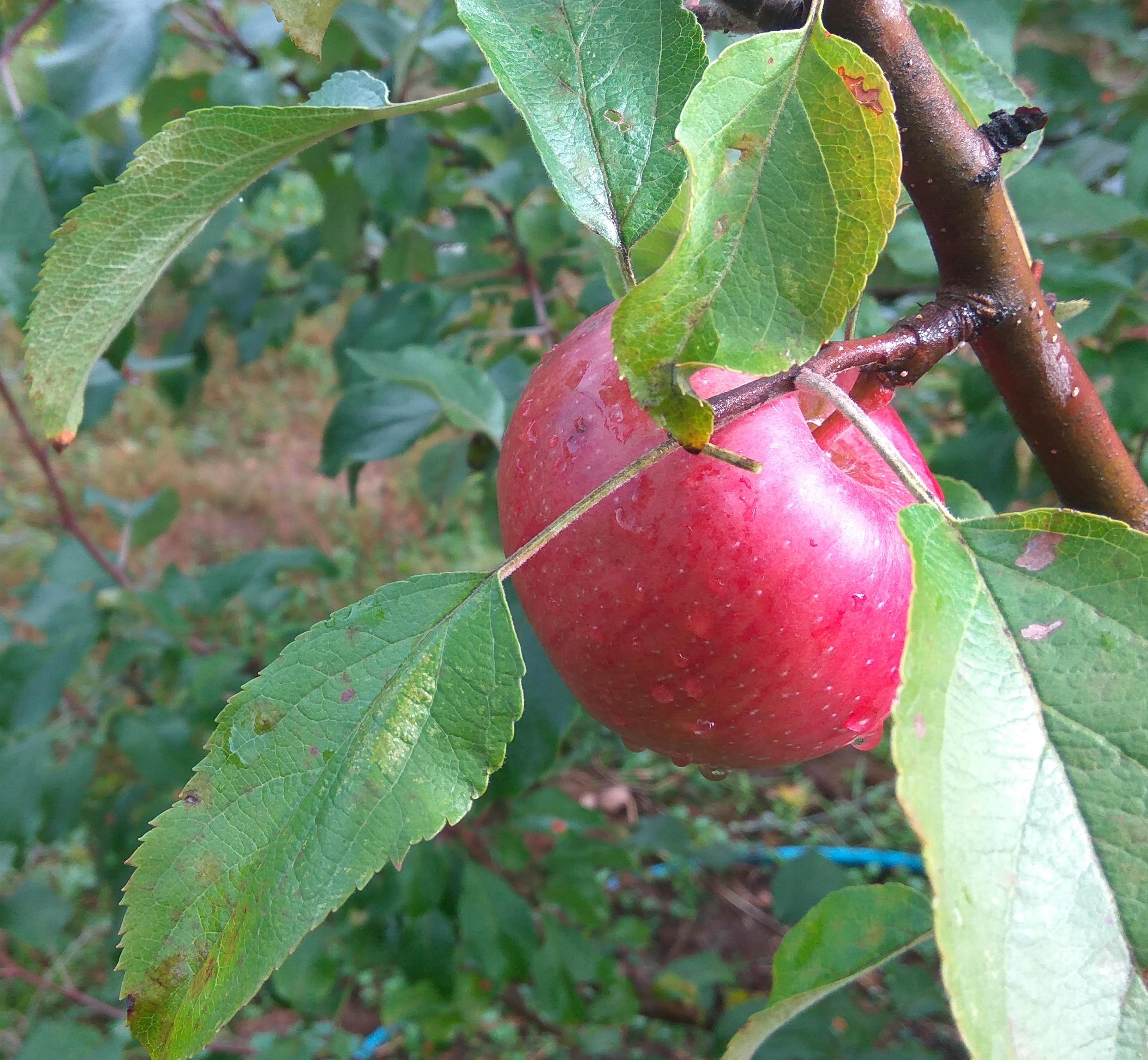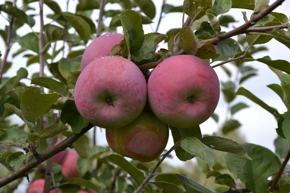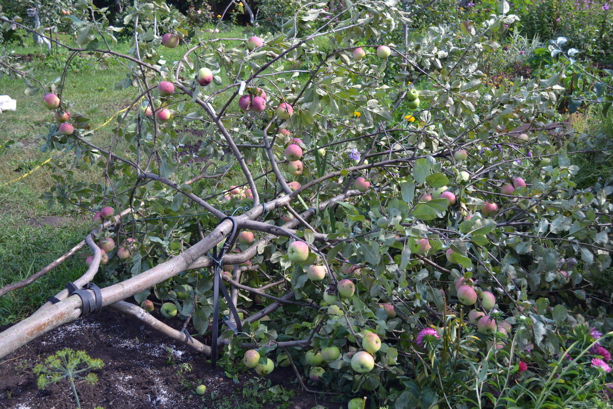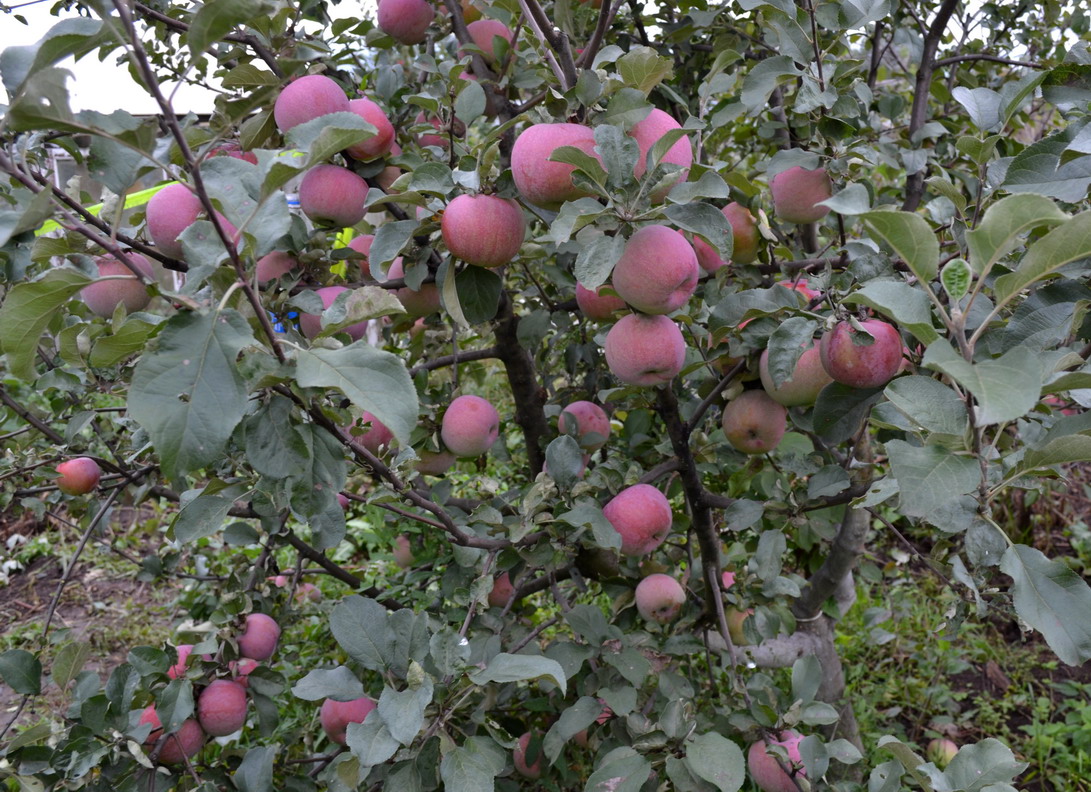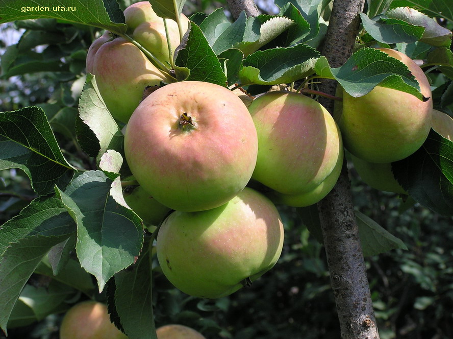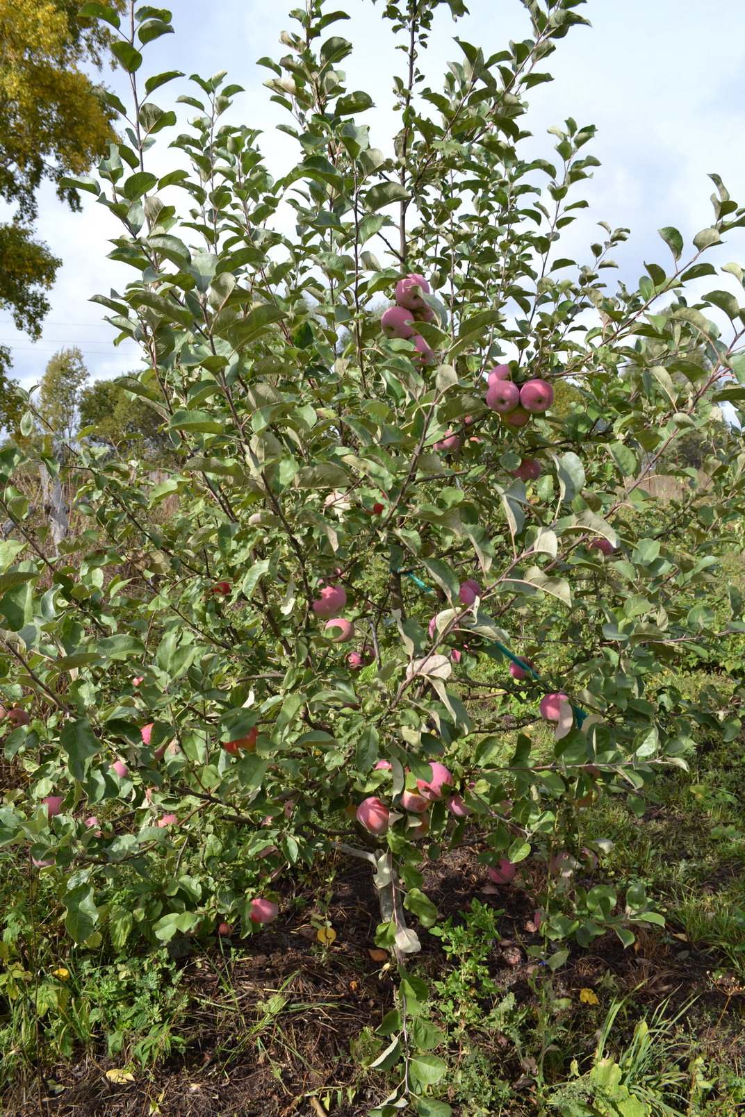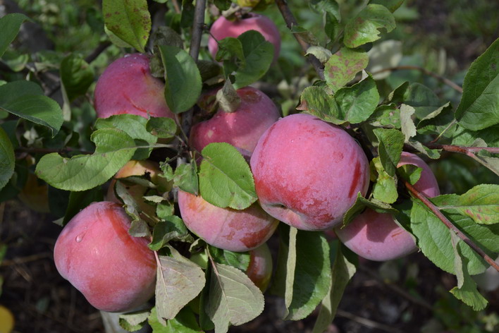 Красные яблоки, летний сорт, дерево сильно рослое. Дерево по высоте раза в два опережает деверья посаженные в один год, а по объёму кроны больше раза в 2,5.
