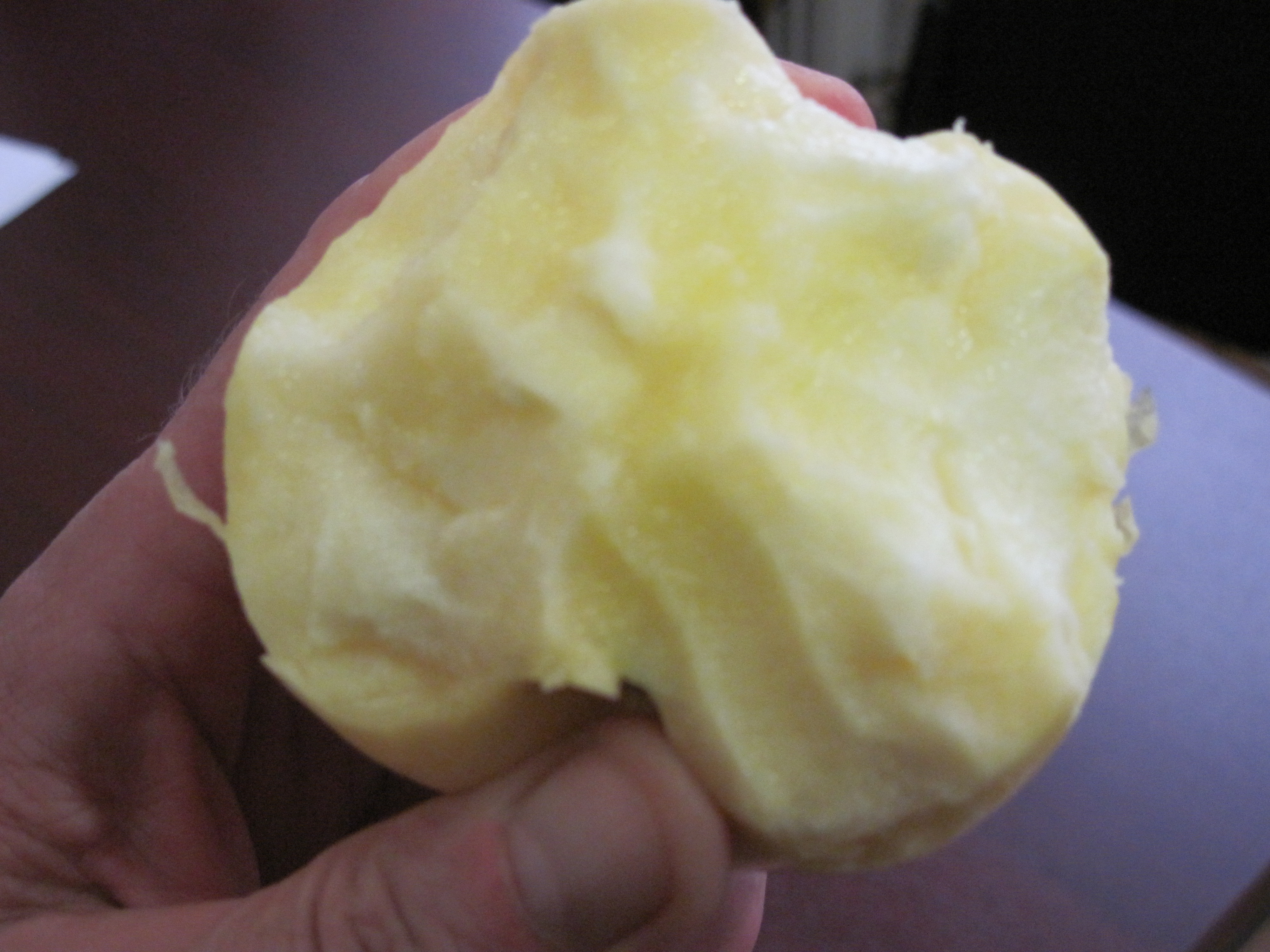 Вполне съедобны с дерева, вкус сладкий, приятный, с ароматом - ничего экстраординарного. Размер средний. Кожица толстая, прочная. Мякоть скалывающаяся. Был небольшой налив, но, возможно, это связано с экстремально холодным и сырым летом. Сорт скорее позднеосенний чем зимний.