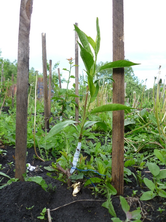 В этом году решил сделать для себя саженец персика,не знаю что получиться из этой затеи,привил сорто образец Персик номер восемь,очень интересные листья.