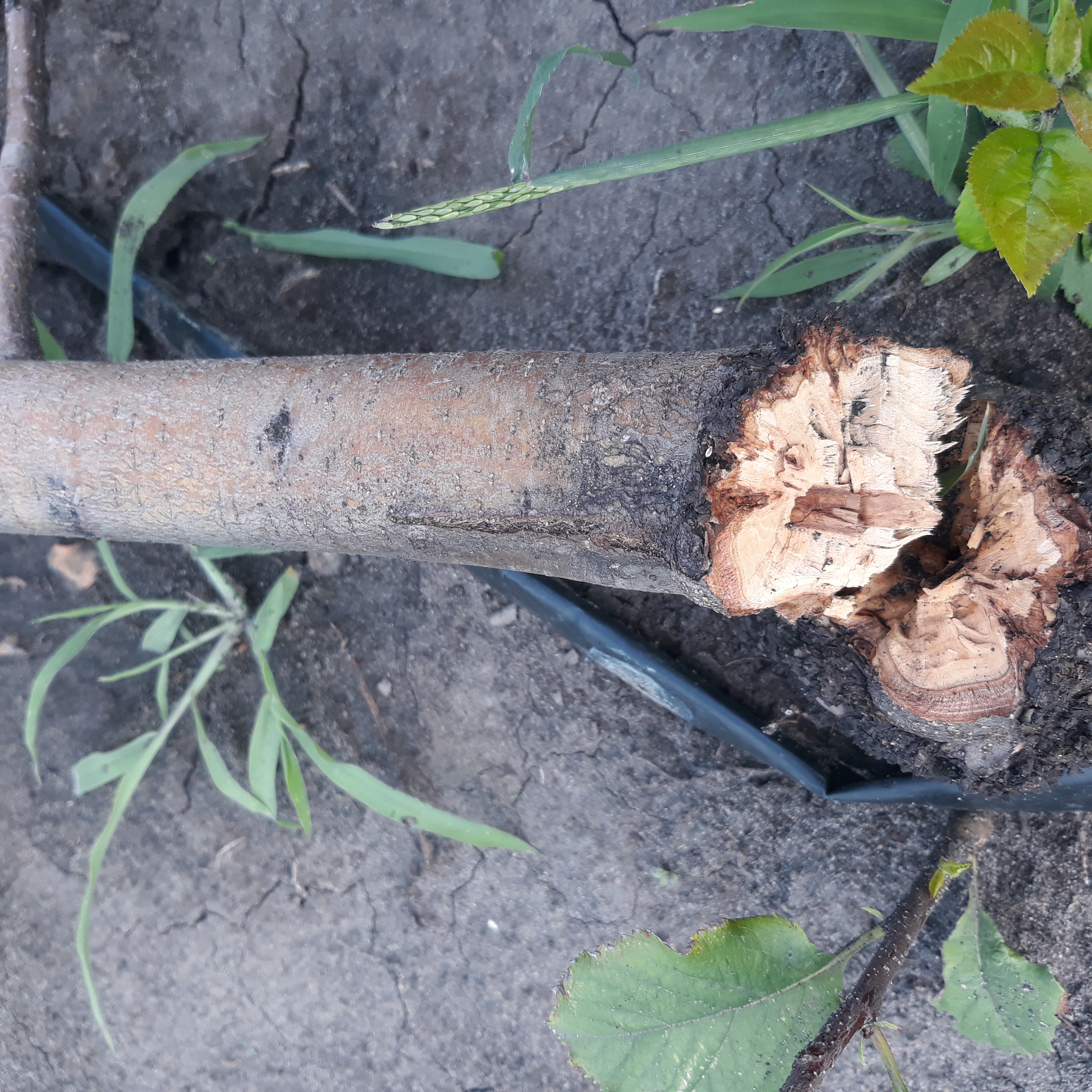 На фото отлом яблони сорта Амброзия на подвое АРМ-18 в районе бернот. Дерево (4 года) привязано к колышку. Было сигнальное плодоношение. За 4 года колышек подгнил и при ветре дерево упало. Ю. В. Косицин писал, что АРМ-18 не требует опоры. А. И. Сычев в описании подвоев на сайте "Росток АГРО", пишет, что подвой АРМ-18 имеет хрупкость в районе бернот и поэтому требует опоры. У других яблонь на этом подвое (примерно 20 штук) такого явного недостатка не наблюдается, но я начал бояться. Посажу всех на кол, как в старой России.(шутка).