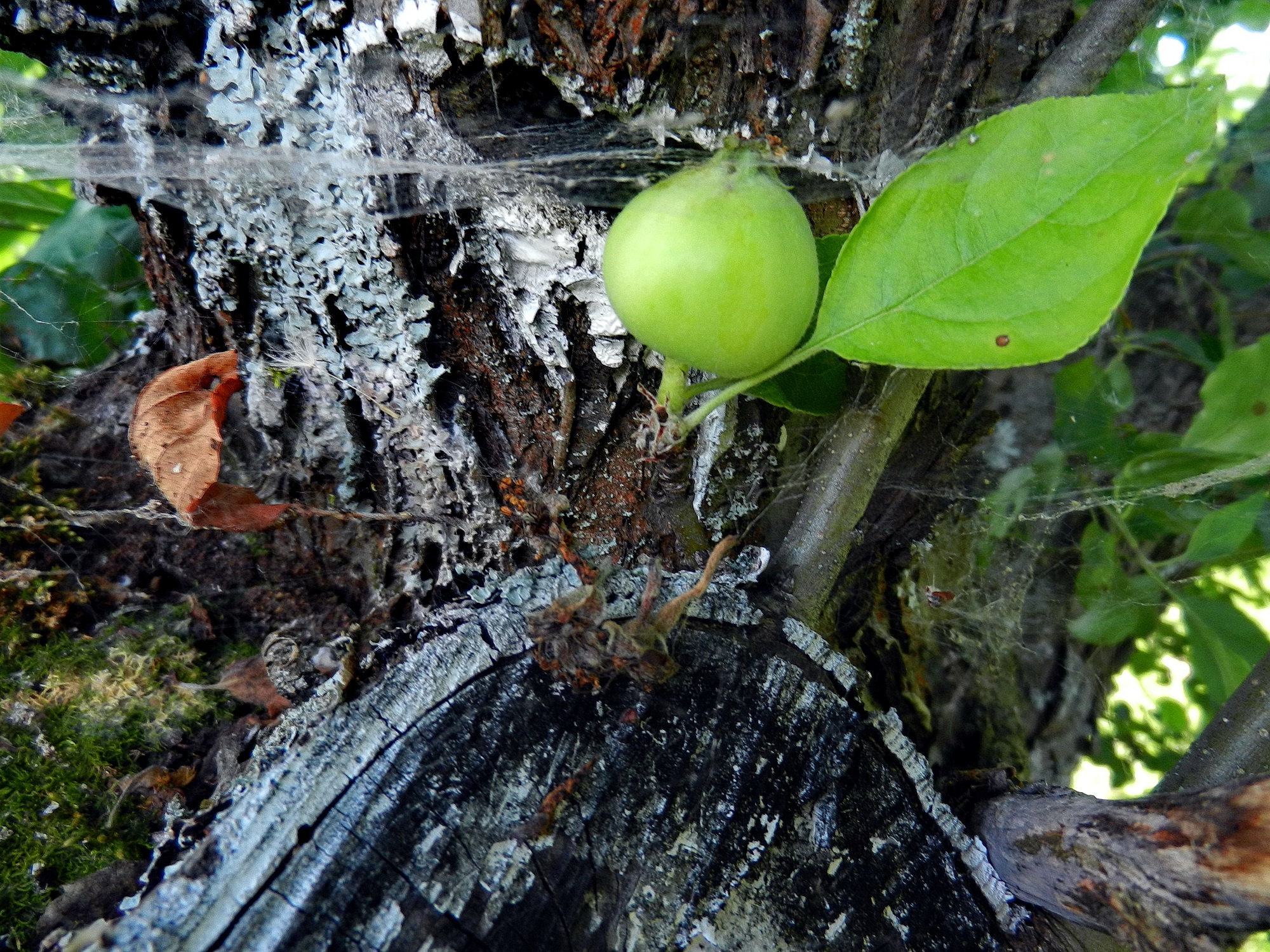 В прошлом году такое пятно было одно, я на нем вырезал всю черноту, обмазал азофосом и замазал бальзам-лаком. В этом году заживания не наблюдаю на нем, и вот стали появляться еще пятна. Сама яблоня выглядит неплохо, нормальный лист, есть урожай, сорт - Ананас Бержаницкого. Прививка в пенек тут получится, мне и яблони этой жалко, сорт хороший. Прививки мостиком в обход этих повреждений можно было бы попробовать, это интересно, я так не делал, но все - же новые появляются пятна.
