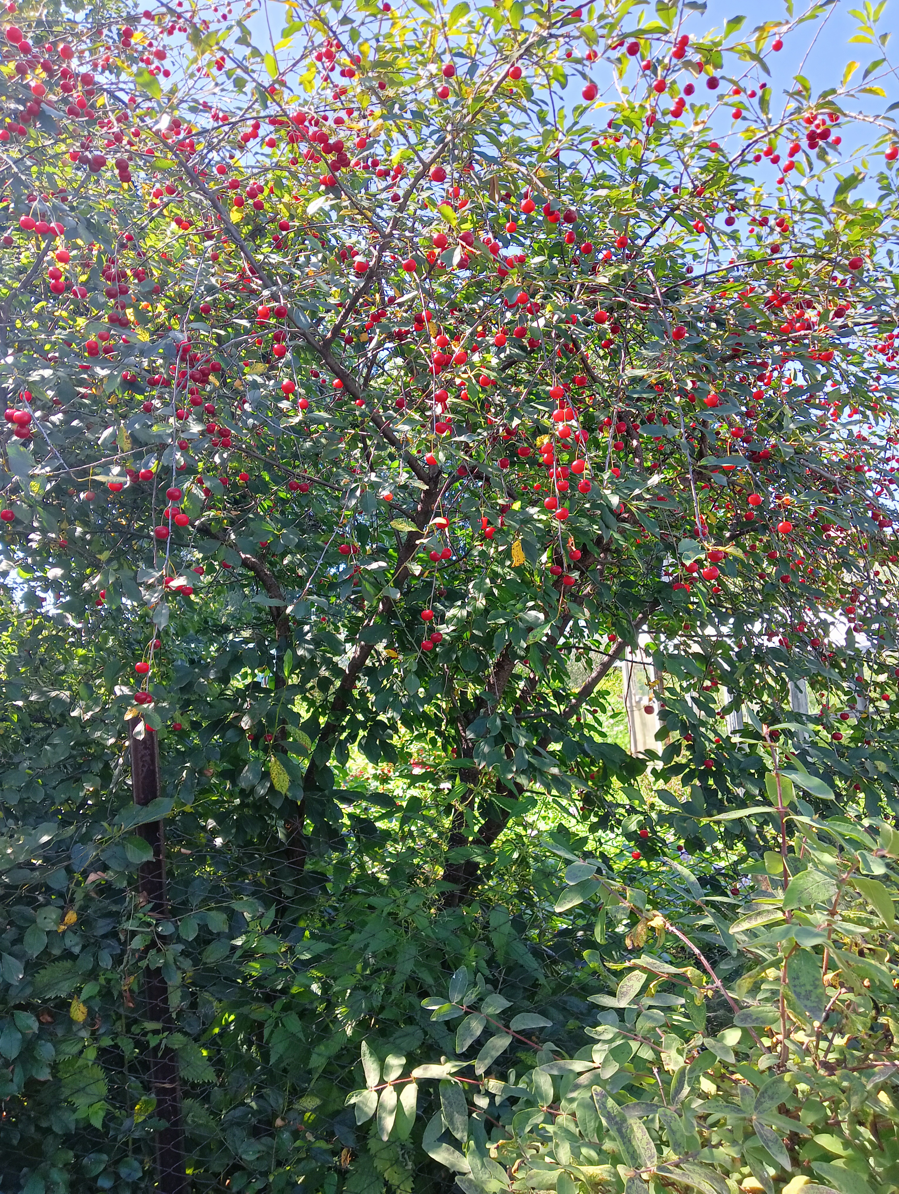 Начала созревать сортовая вишня. Порослевая, причём разных сортов, ещё только-только начинает краснеть. Что удивительно, та же Застенчивая поздняя должна быть.