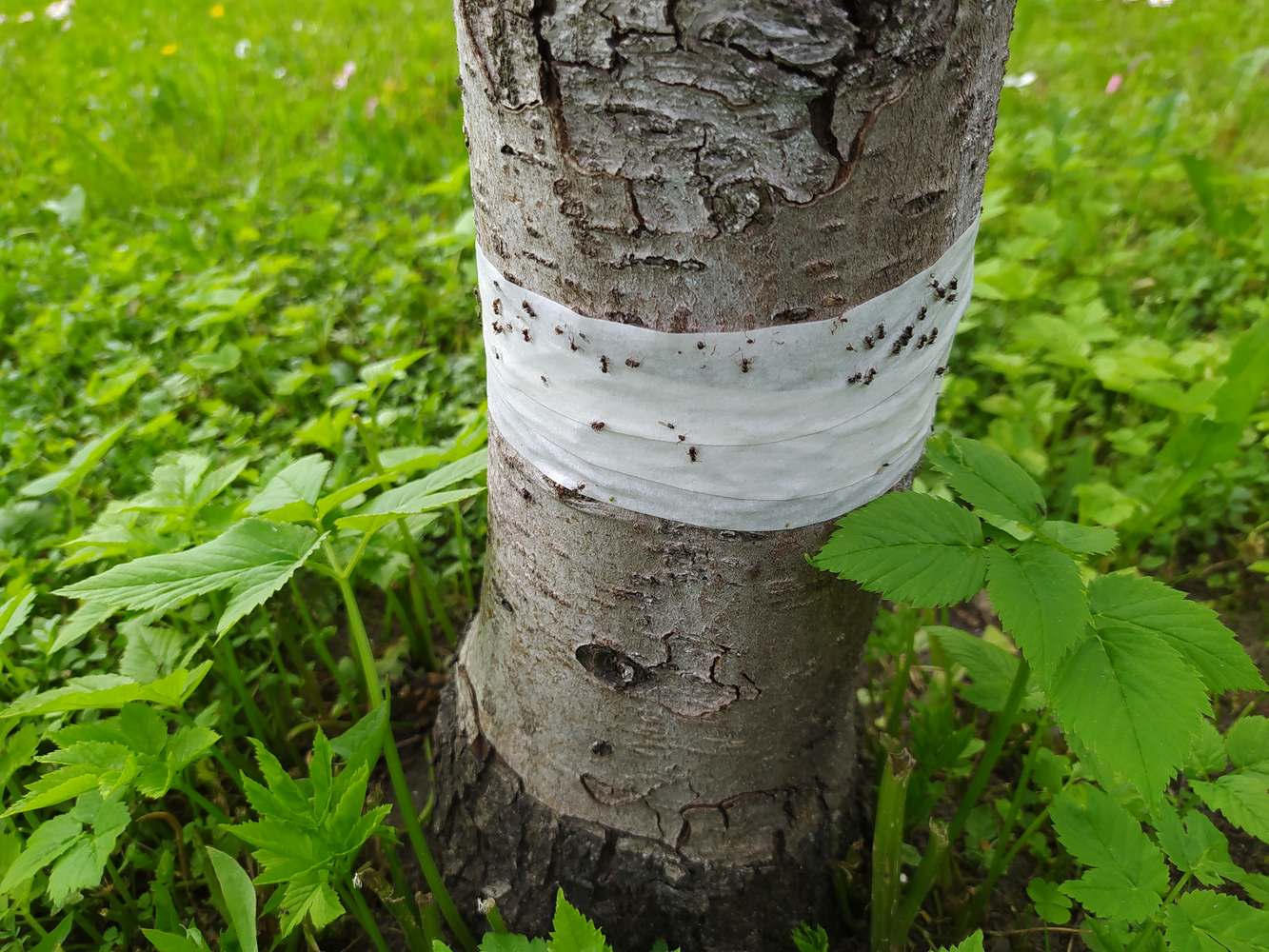 Если посмотреть на фото внимательно, то становится понятно, что на поясе зафиксированы муровьи, которые вечером возвращались домой с "рабочей смены". А их товарищи в обратном направлении пройти просто не решились (не смогли). В данный момент дерево абсолютно чистое. При достаточной ширине полосы она становится для них непреодолимой. Осталось выяснить, как часто надо менять такой пояс.