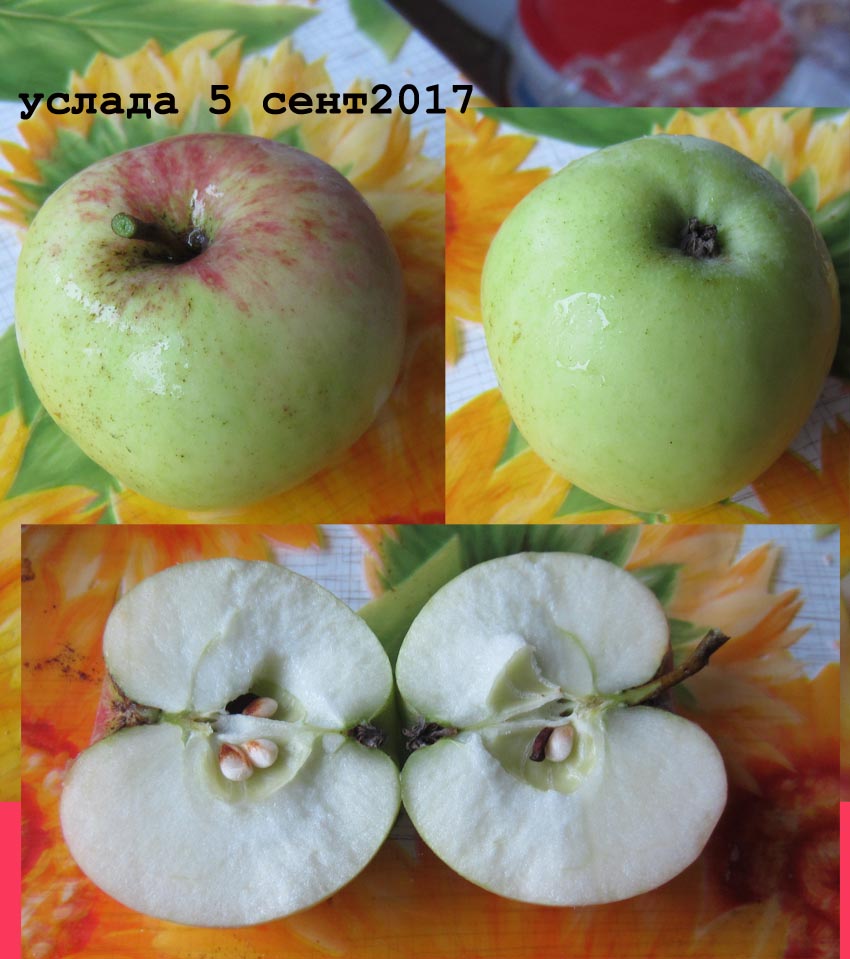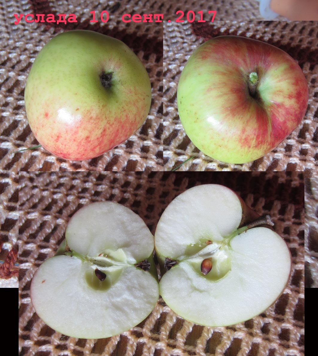 Мякоть сочная, скалывающаяся, кисло-сладкого вкуса, с преобладанием сладкого. Желтоватая на срезе. Семечки уже коричневые.WP_20180907_003.jpgWP_20180907_002.jpg