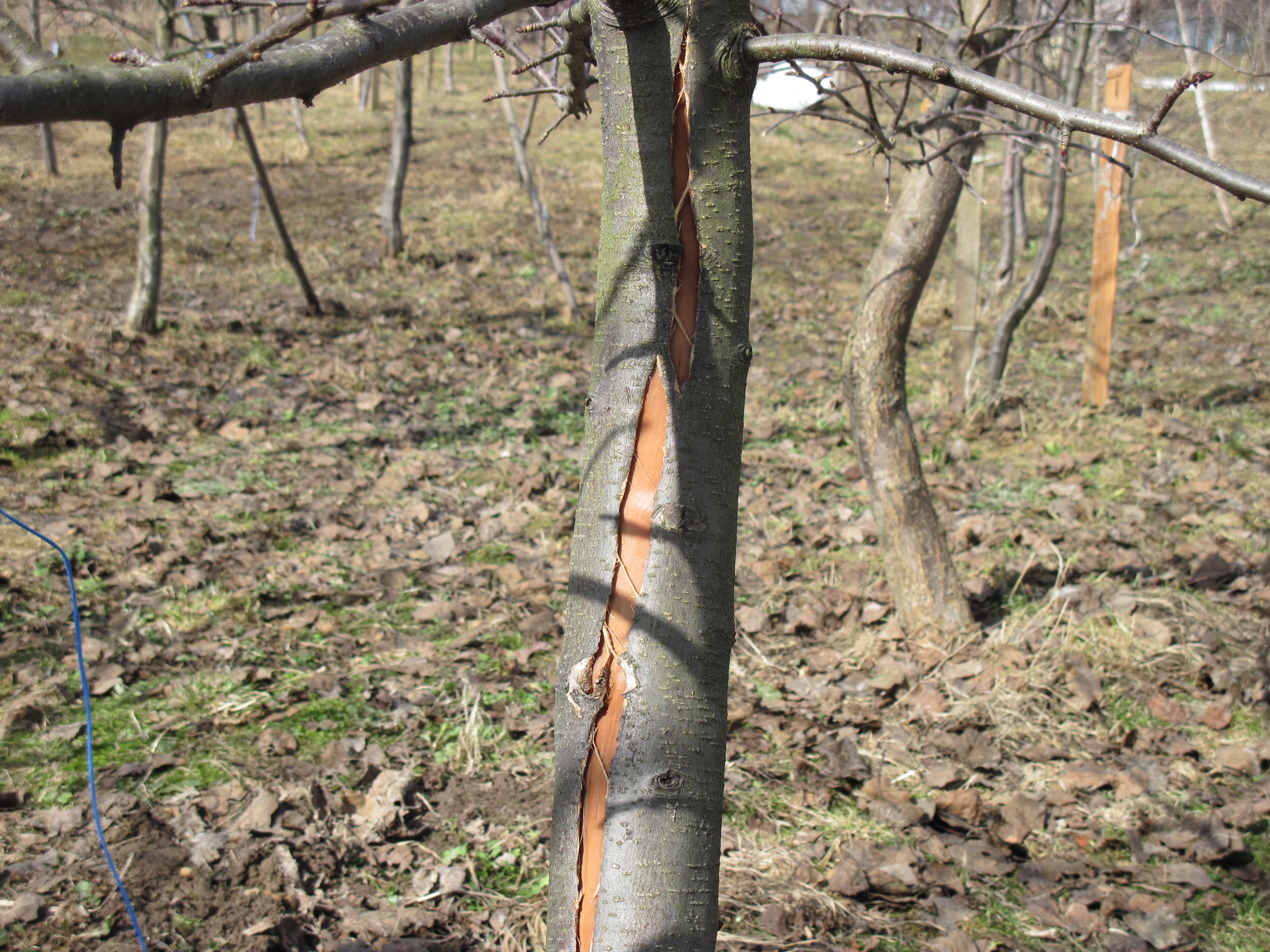 В прошлые выходные обнаружил одно дерево с разорванной корой, в эти еще четыре. Хочу отметить, что пострадали корнесобственные деревья, производные от незимостойких родителей - Тарелочное, Шафран саратовский. Пострадали не все, а только на высоких штамбах и с южной стороны, предполагаю в конце февраля-марте, с большим суточным ходом температуры.