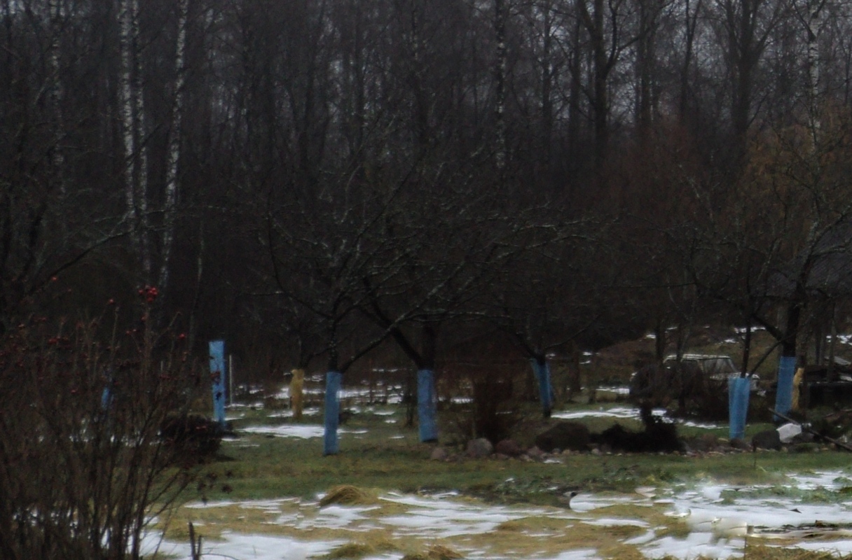 Да, эта зима какая-то необычная. Сад у меня перезимовал хорошо, нет повреждений морозом. И от зайцев всегда укрываю деревья в саду москитной сеткой, может, она и не так долговечна, как малярная у Ирины, зато не резали на "бинты", а просто разрезали на куски сантиметнов по 50-80. Есть же голубика, которую зайцы тоже любят - ей куски по метру не помешают, хотя кусты связываю. Сад выглядит так