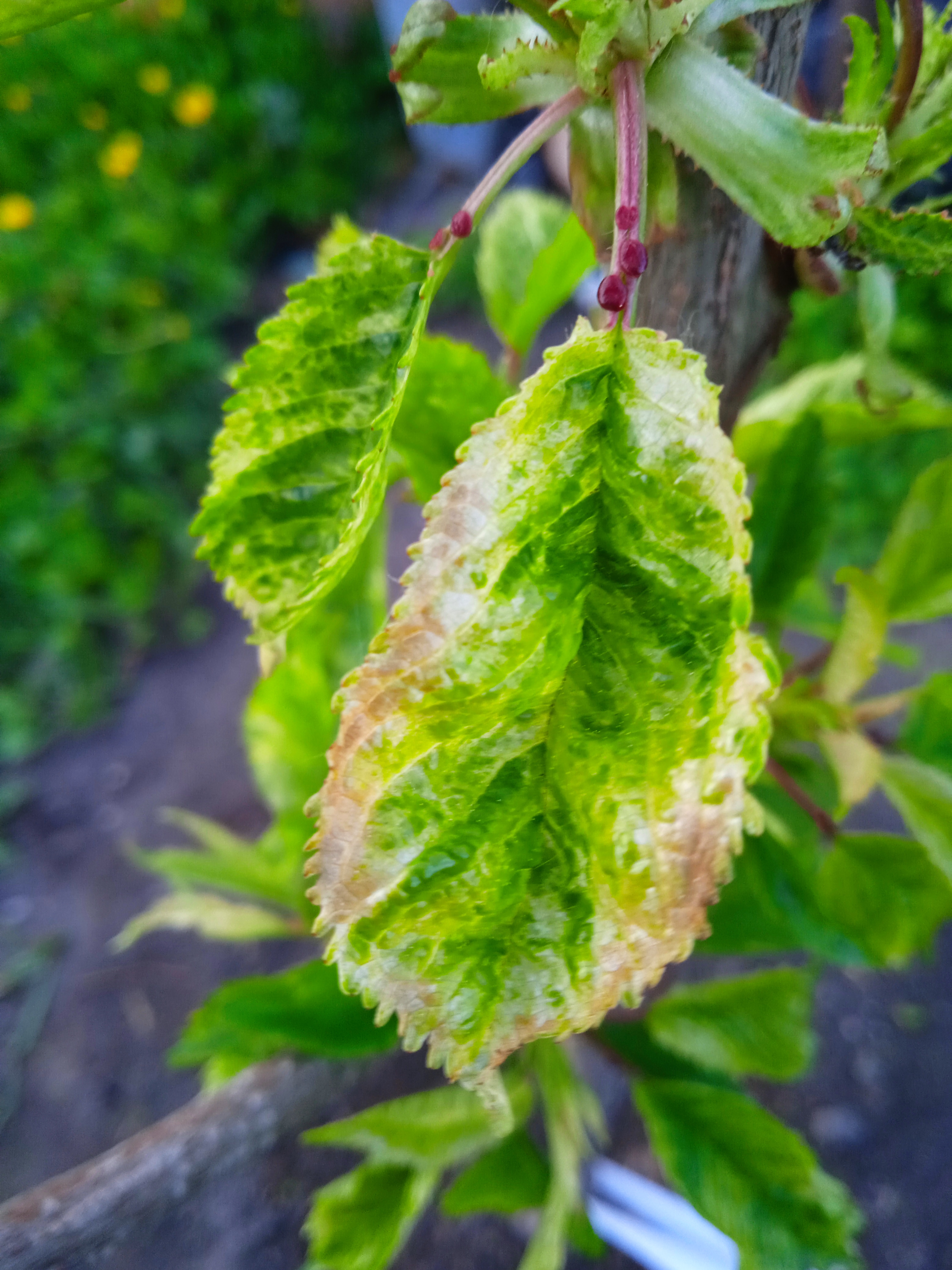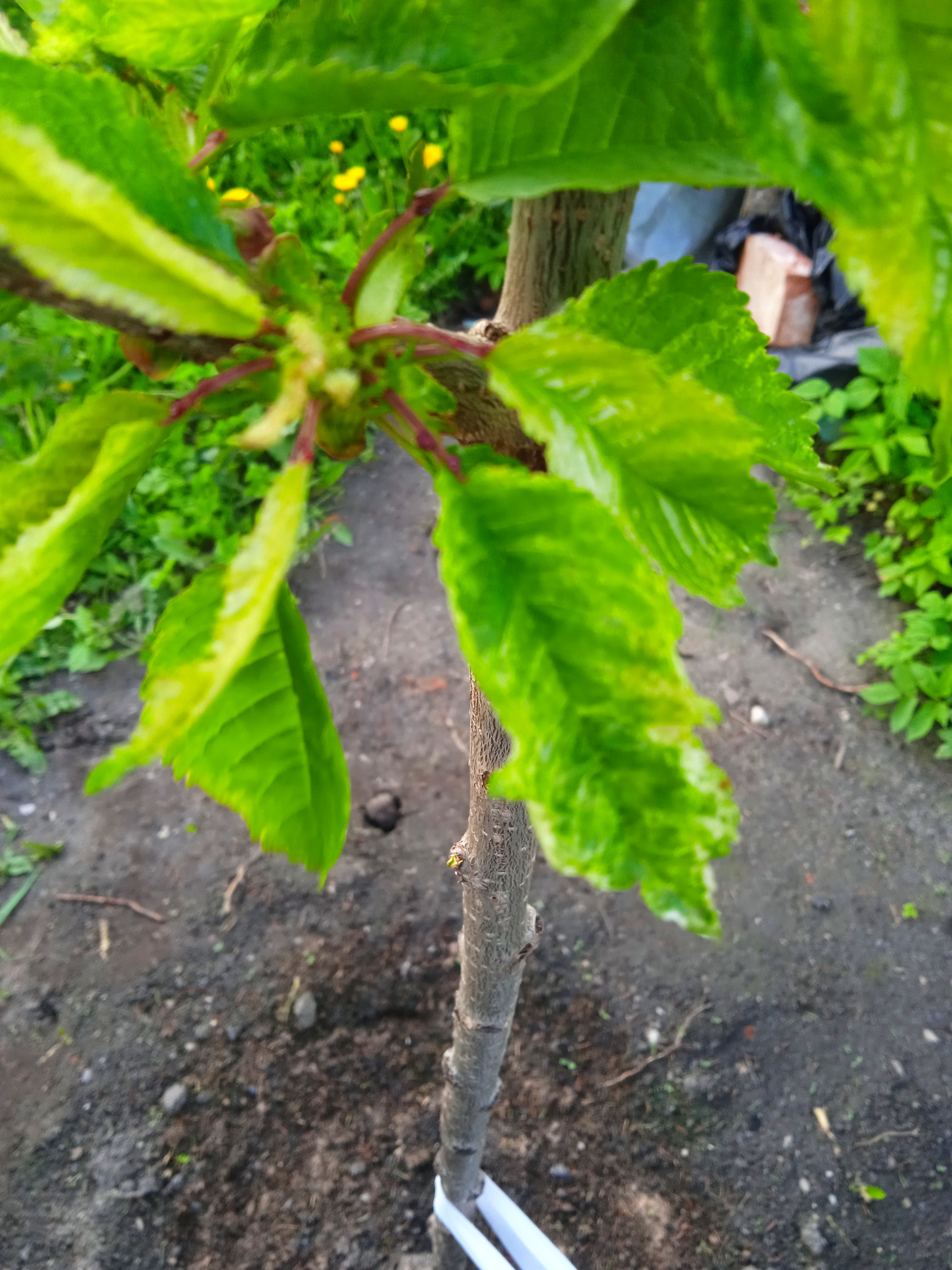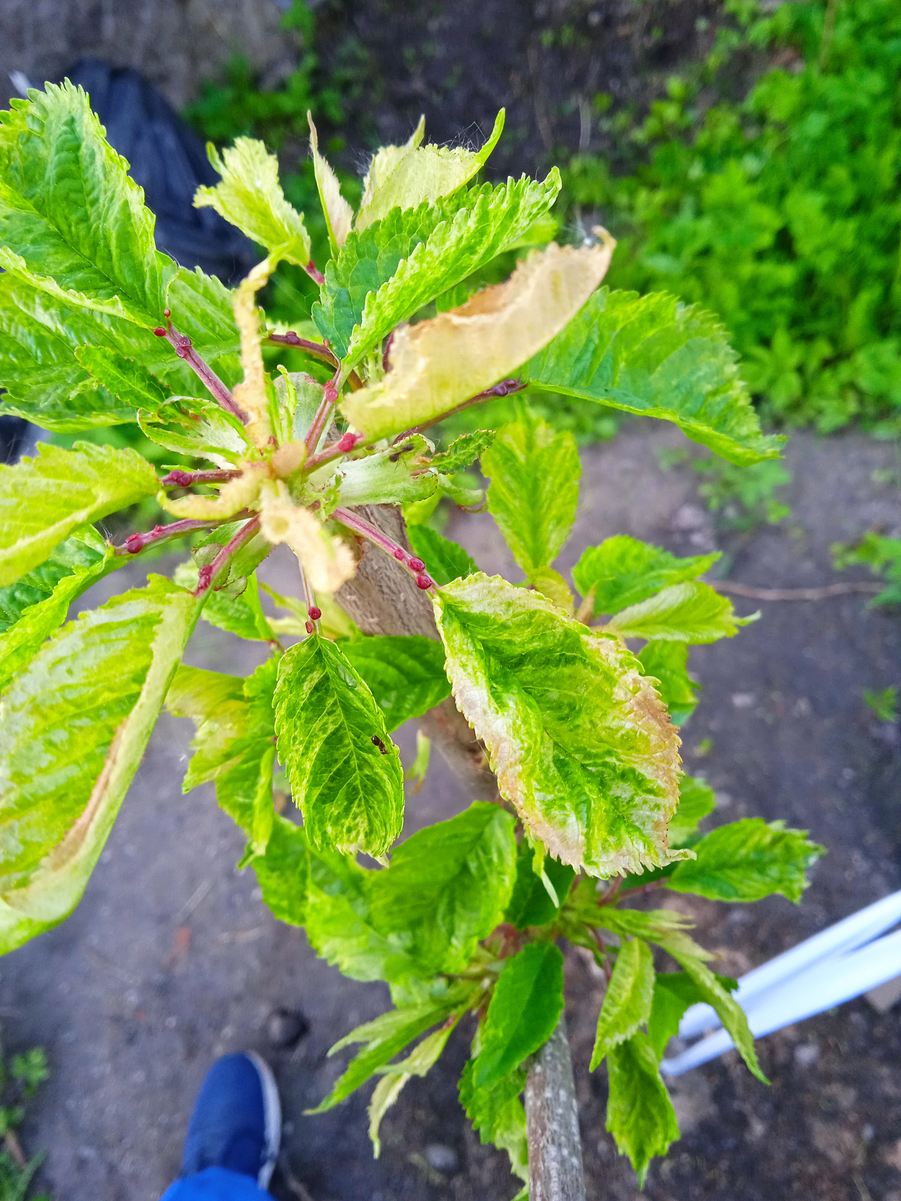 Привет уважаемые садоводы. Посадил черешню с осени. Сейчас вот такие листочки на ней. Кто подскажет, что это может быть и почему такой лист? Может это быть от вымокших корней? В воде долго стояла весной. Сорт Бурлат. Другие черешни которые сажал с ней, нормальный лист.