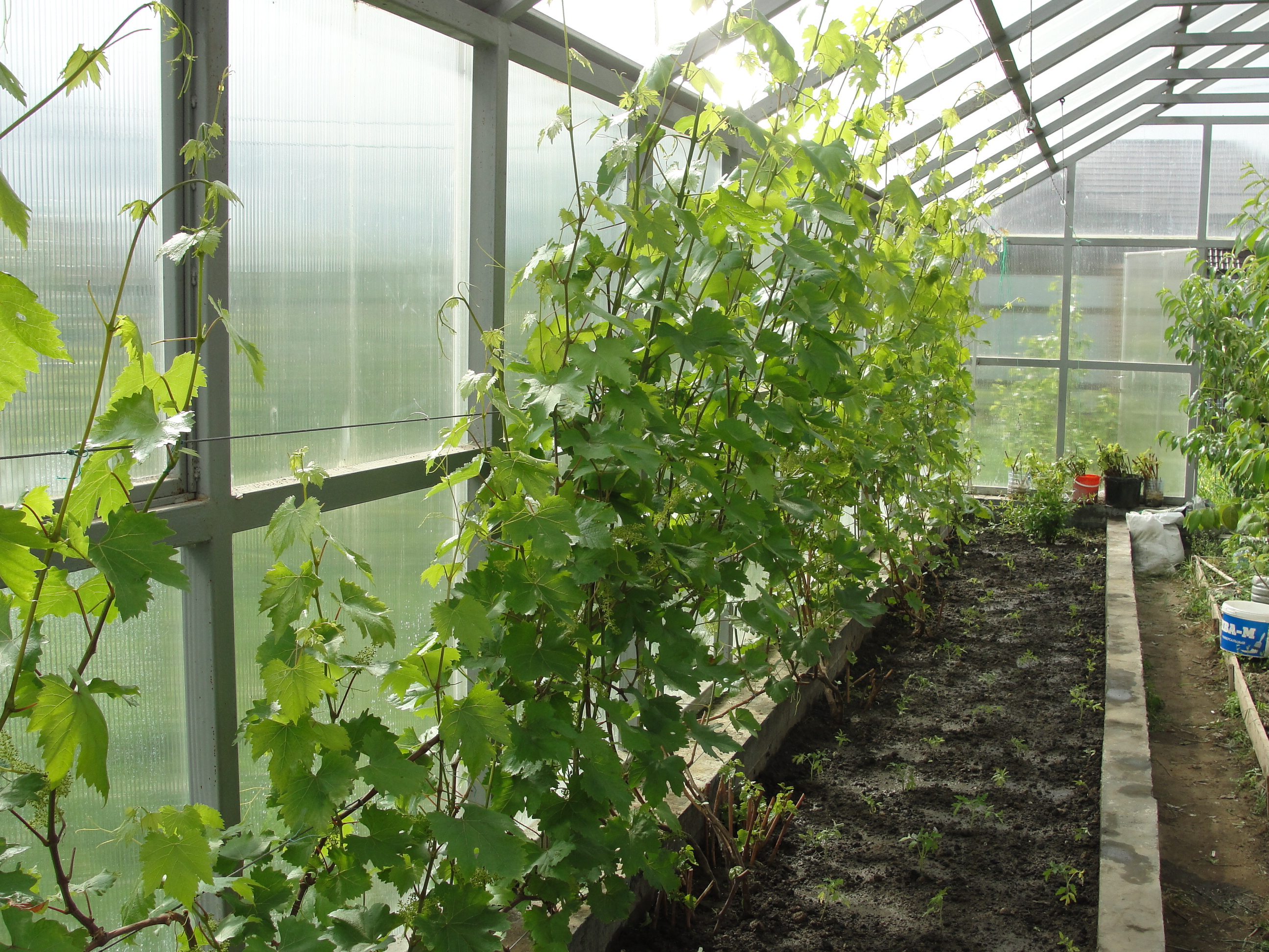 Так вот, проблема с опылением стоит на первом месте, но, для меня, она довольно легко решаема — есть несколько кустов зимостойкого, неукрывного винограда, растущего на высокой шпалере и цветущего длительное время, оттуда беру кисти и опыляю в теплице, а поскольку кустов там не много, то это вообще не проблема.