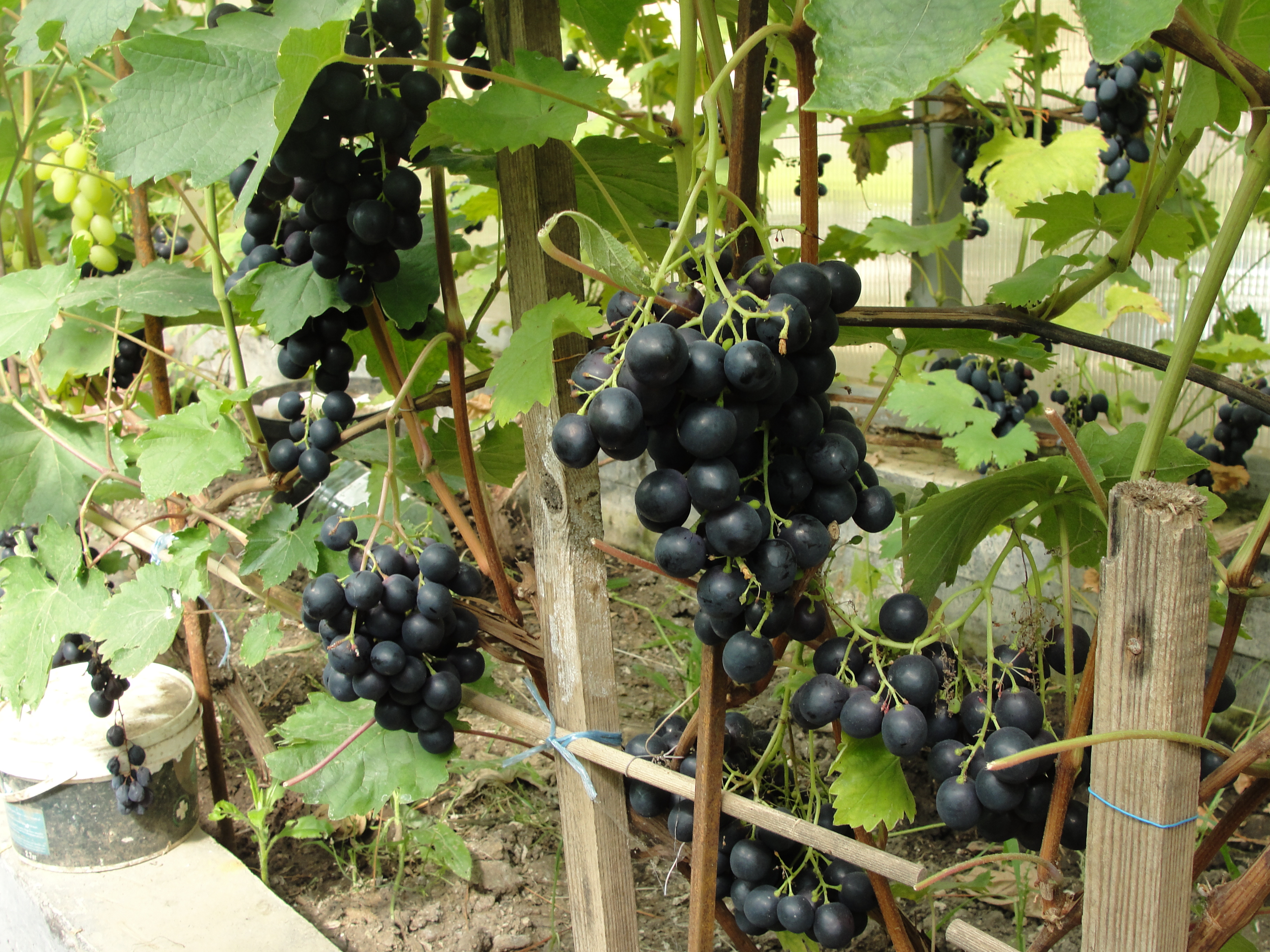 Грозди на всех кустах не большие из за перегруза , но ягода не мельчает . Весной конечно всё культурно выглядит ...виноград высажен вдоль обоих стенок и этого кол. с головой хватает