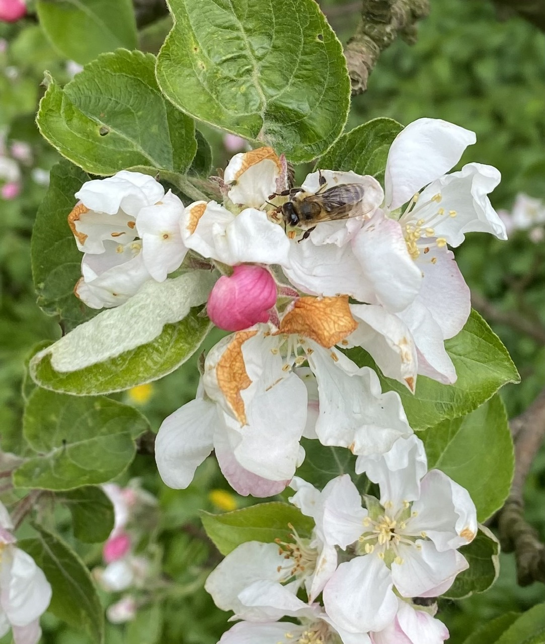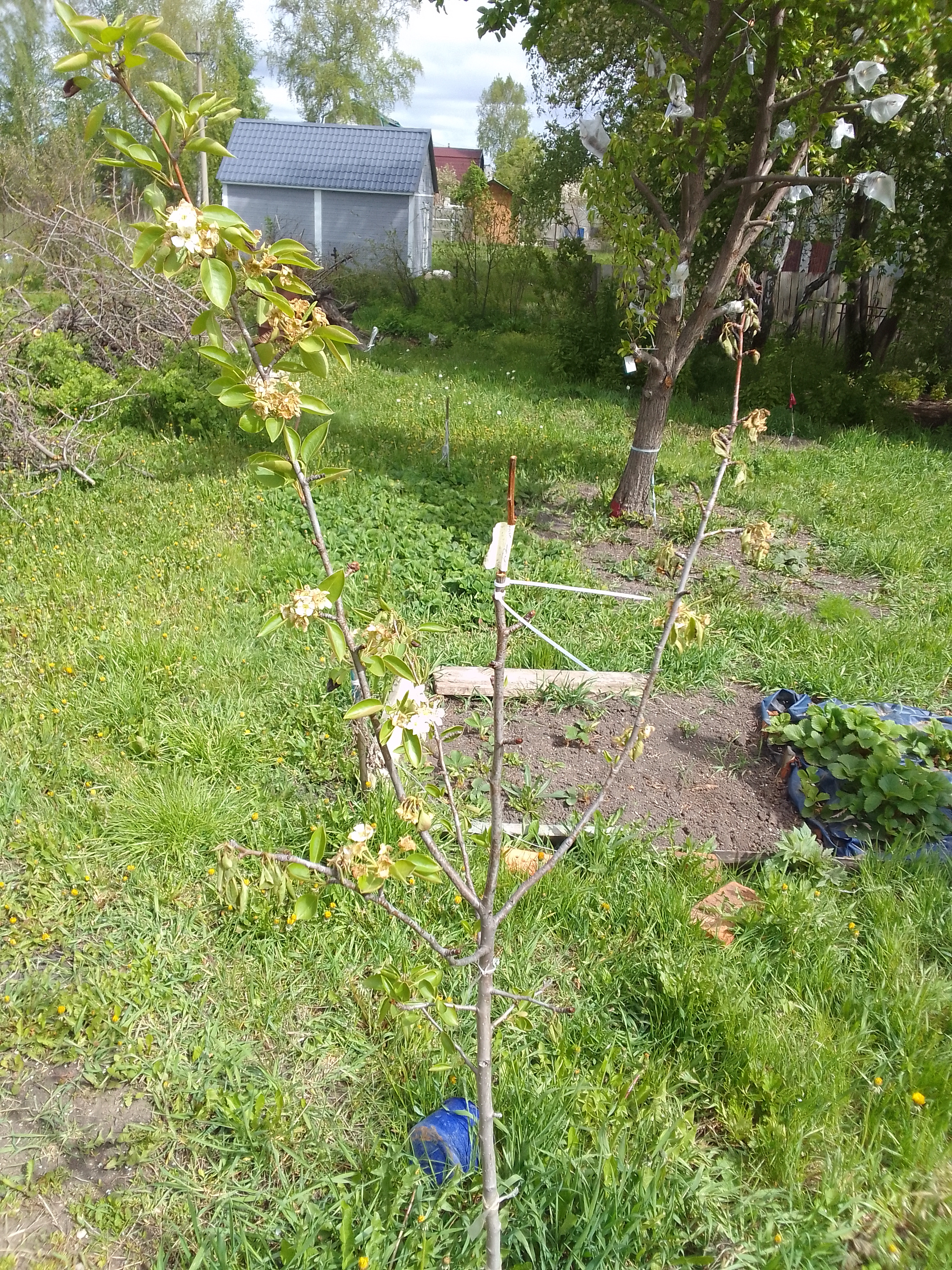 Последствия заморозков оказались значительными - тоже повреждены все цветущие кисти смородины, в этом году впервые за всё время без ягоды, груши тоже не будет. Яблоня цветет, возможно что-то завяжется. С клубникой пока непонятно: то что цвело - повреждено, а остальные кусты в бутонах, будем посмотреть.