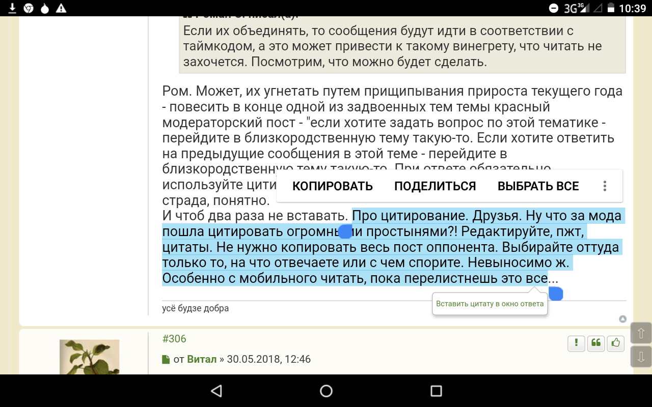 Выделяю слово, затем растягиваю синее поле до абзаца, нажимаю всплывающее окно "цитировать", но в окно ответа попадает почему-то лишь одно слово, которое выделил первоначально.