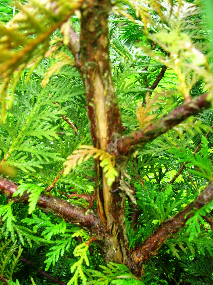Как-то давно меня предупреждали, чтоб впроголодь держала туи. Не стоит кормить, а то кора треснет. А всего-то по весне комплексного подсыпала, впервые в туиной жизни. Рванула, и на тебе.