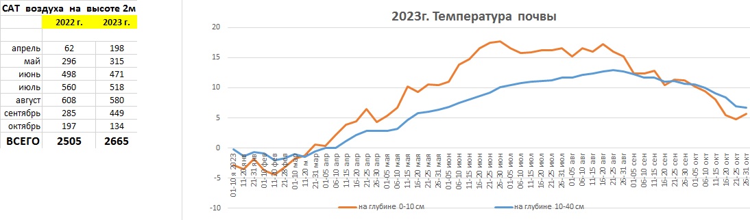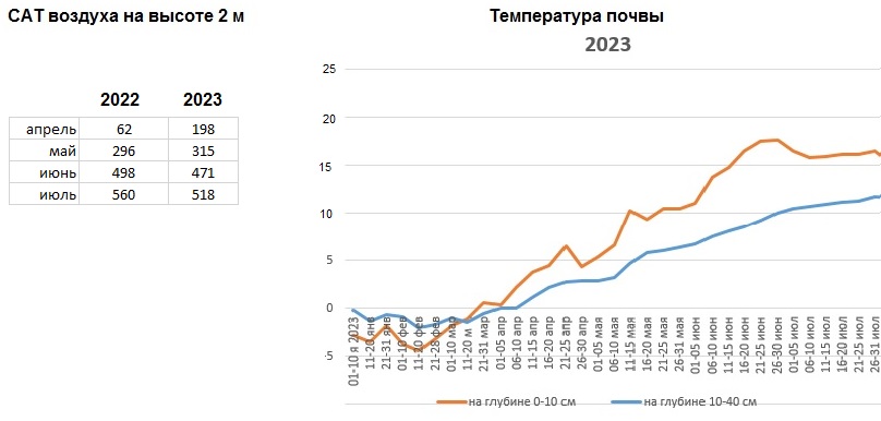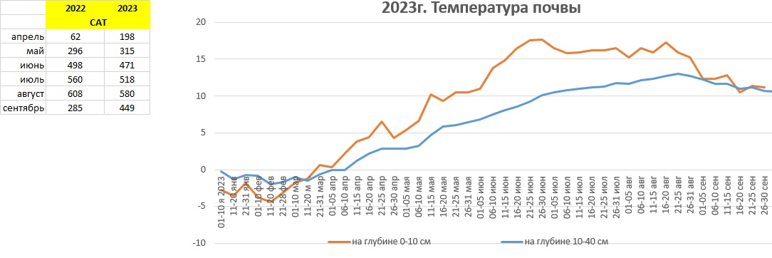 В это лето у наших яблок(летние сорта) и груш(Чижовская и Академическая) ни окраски сортовой, ни сочности, ни вкуса. Сравнила условия созревания плодов(месяц август) этого года с эталонным 2020(самые вкусные плоды и урожаи). САТ(август, 2023)=602 градуса. САТ(август, 2020)= 535 градусов.